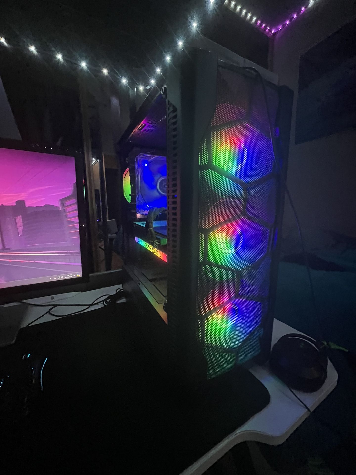 IT DOES HAVE THE GLASS PERFECT CONDO JUST DONT HAVE IT ON CURRENTLY Streaming and gaming computer for sale: ¡9 9900k cpu 16gb Corsair ddr4 rams Evga RTX 3070 FTW3 overclockable(not regular 3070) 1Tb M.2 ssd (like new) Msi pro series motherboard Apevia 600W gold power supply Pc case bought from Microcenter (like new) 4x rgb case fans came on pc case Updated cpu cooler (65C max temp) Podcast Microphone (like new) 12 pack acoustic foams (like new) 2 pack LED streaming lighting (like new) 1440p HD Webcam (like new) Gaming headset (designed for ×box, works well on PC as well) (like new) Comes with keyboard And mouse Fresh Windows 11 installed Dell monitor 60hz I played warzone on it with ~ 120fps on a 60Hz monitor. with a higher end monitor you may possibility get smoother experience. Currently being used for Ai art generation. Also comes with desk, mouse pad, chair desk has a Minor scratch. Or trade for something else same price