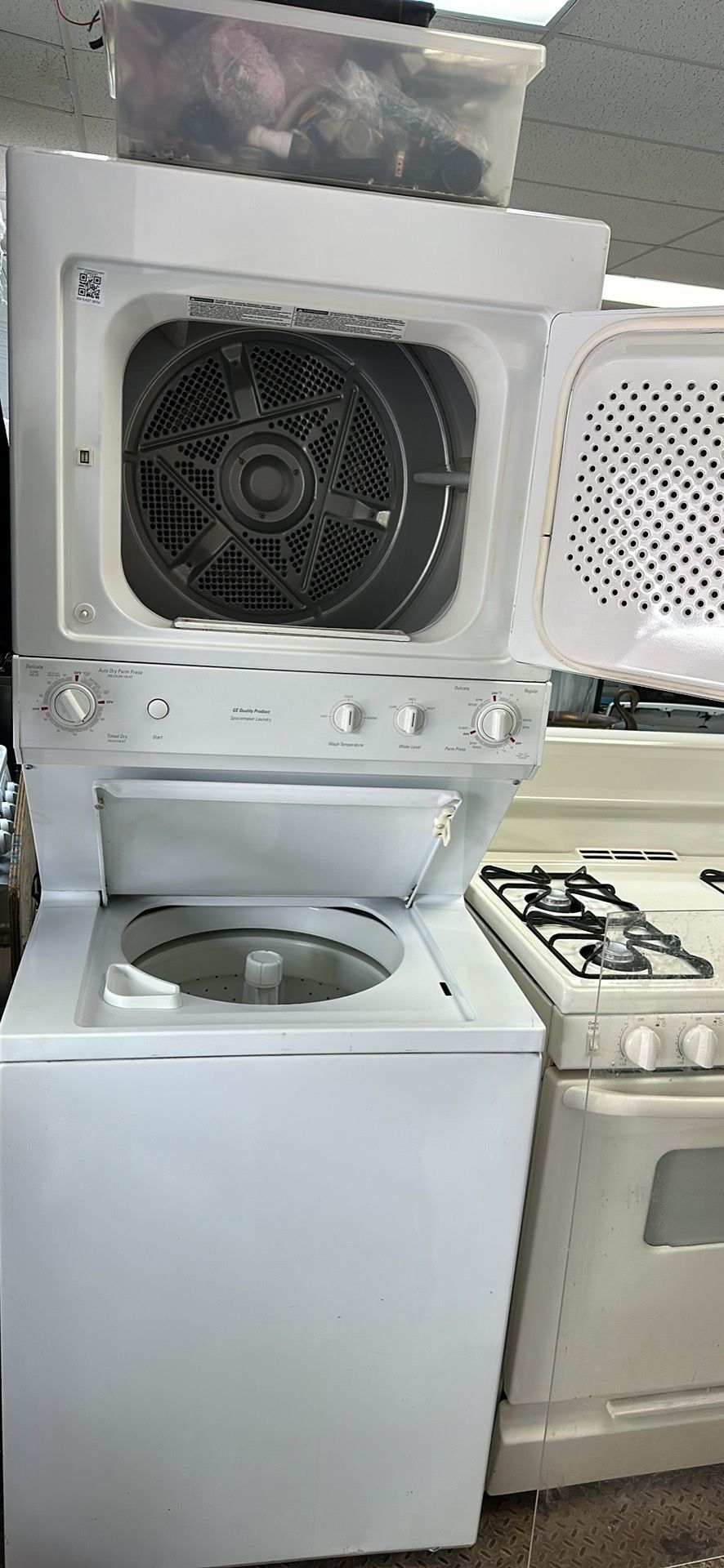 GE 27 in. Laundry Center with 3.9 cu. ft. Washer with dryer 220 Electric & 5.5 cu. ft. White