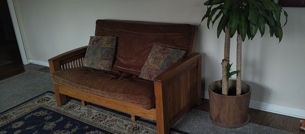 Oak wood Brown suede like material Full size futon We cover it with a blanket to keep it in good condition ( as you can see in the pictures). The two brown pillows are included. Asking $250 or best offer. Will deliver if you can help unload it.