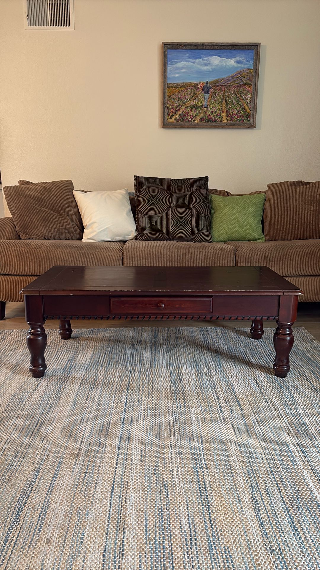 Dark brown wooden coffee table with normal wear and tear. Table: 48” W x 24” L x 16” H Front center drawer: 15” W x 12” D x 1.5” H $50 OBO