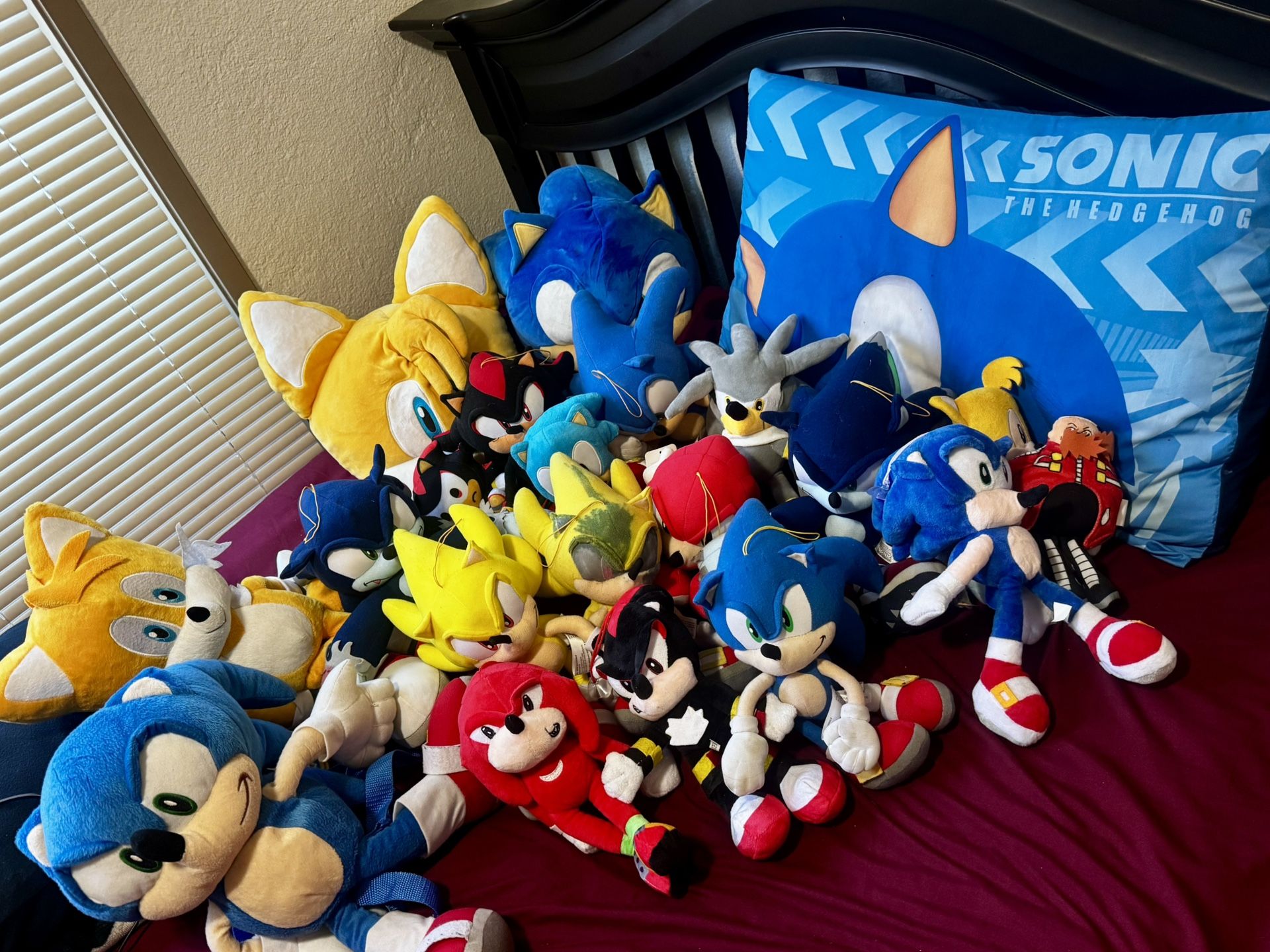 My son has told me he has officially outgrown his love for Sonic. Included: -Full-size comforter (reversible ) and pillow case -2 Sonic pillow heads -2 Sonic and tails backpack plushies -1 Sonic wall decor -1 bed side lamp. AND ALL THESE PLUSHIES! Some with tags still on them. Plushies were originally $30-$40 each. In great condition he only collected them. NON SMOKING HOME. Asking $100 for ALL.
