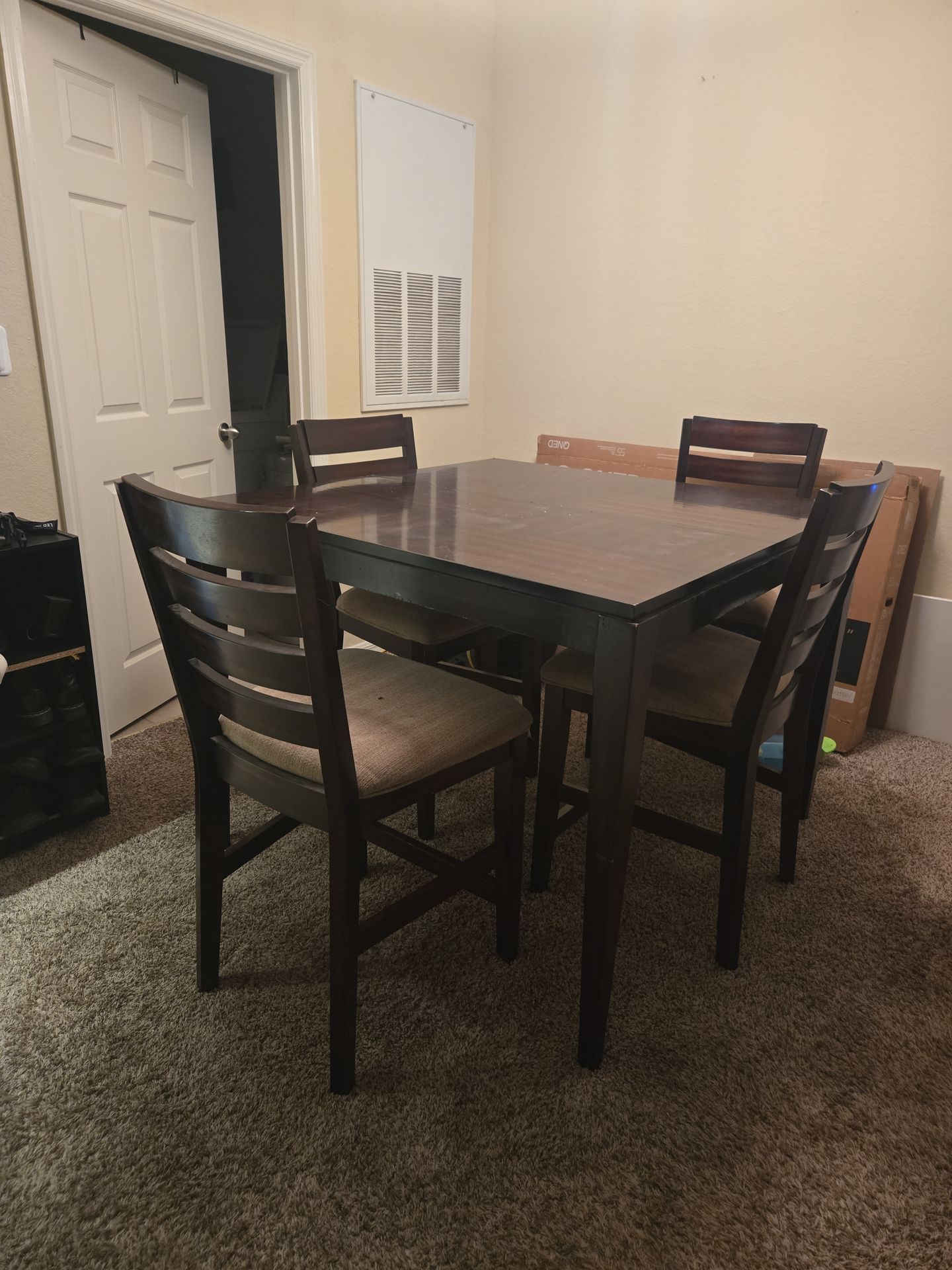 Dining table with some dents/scratches. Dining table can expand to be larger as seen in last image. If getting buyer will need to come to pick up-we are willing to help.