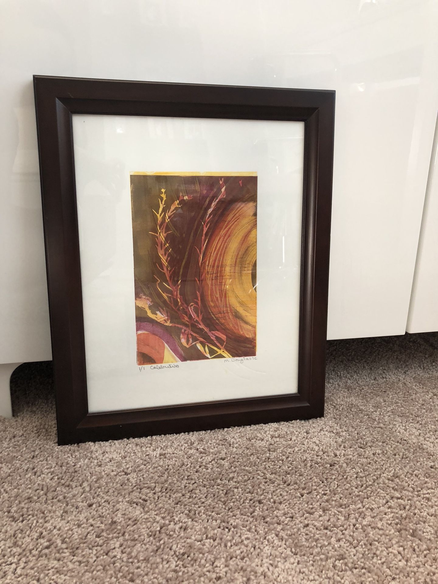 Framed with glass. Mint condition. Original art piece signed by artist. Size with frame is 17x13.5.