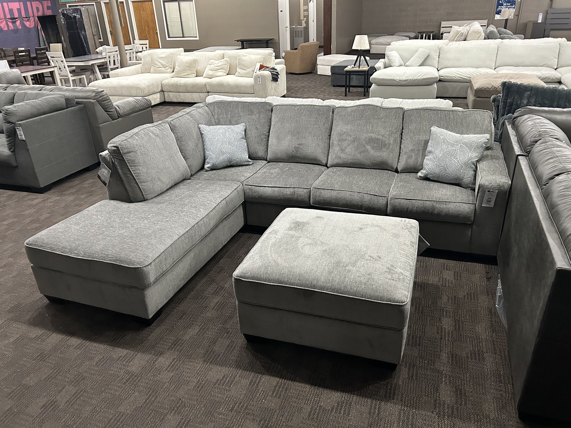 Brand new. Available for quick pick up or delivery. Throw pillows included. Stain resistant fabric. Also available in charcoal gray. Other configurations available. 84” x 115” Ottoman: $299 (36” x 36”) Ask about payment plans!!!