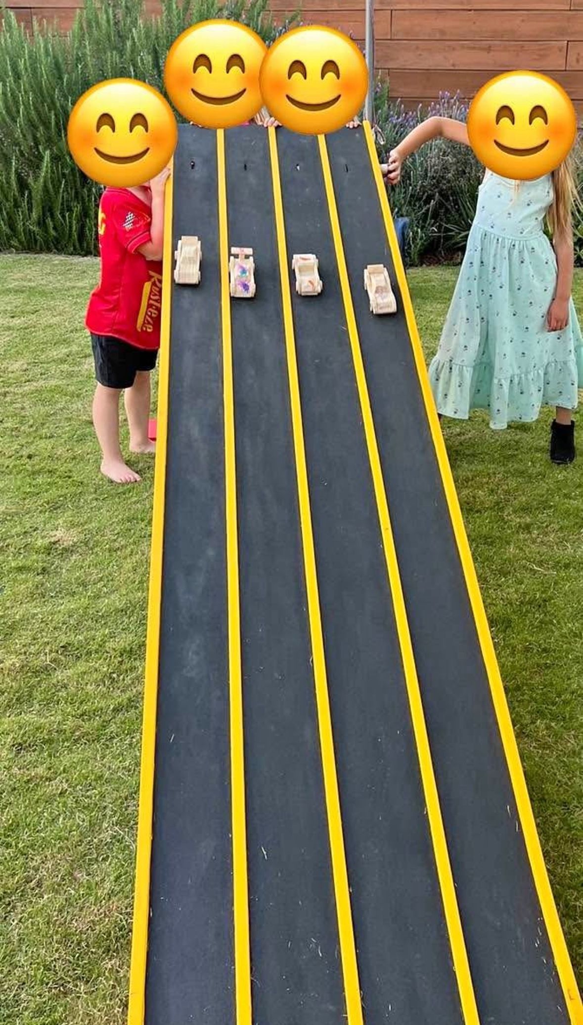 Handmade cars racing slide. Wood Very cool for a party ! Kids love it