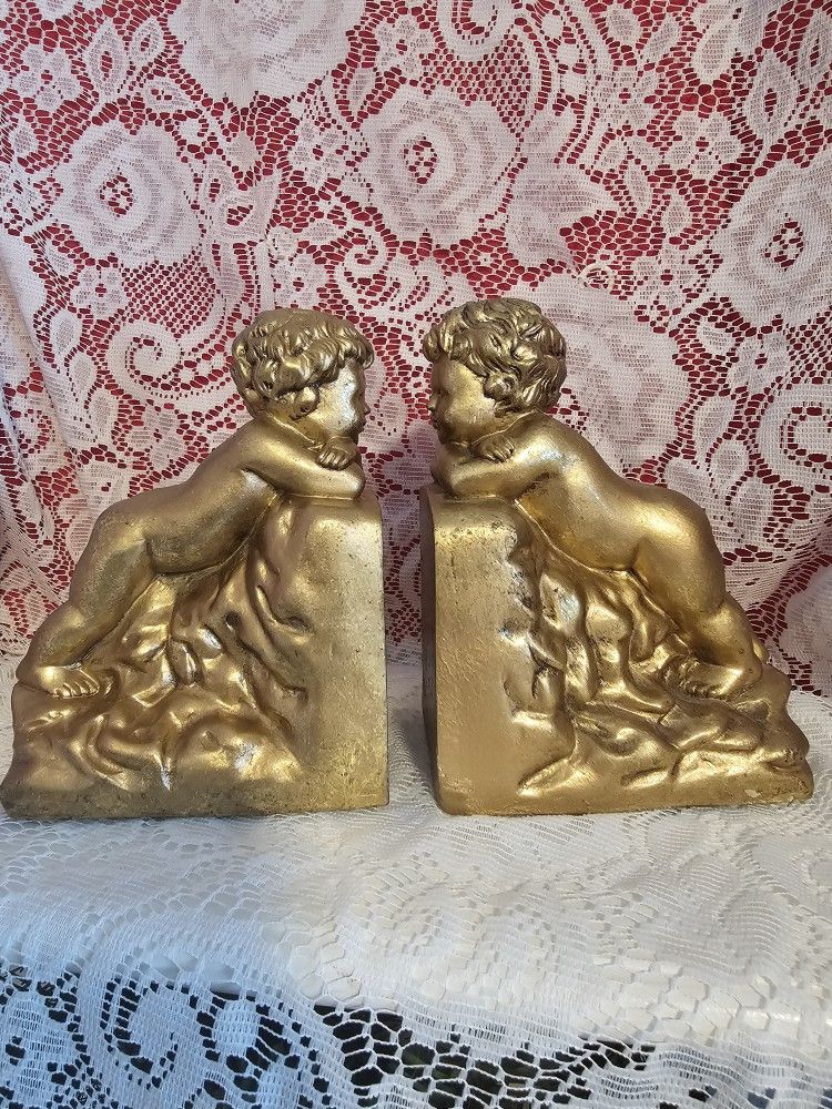 Selling (2) Vtg Hollywood Regency Rococo Design Style Cherubs/Angels Bookends! Heavy Cast Resin/Gilded Gold Tone/Functional, Elegant & Whimsical! Will hold regular size books + they can also be displayed in different ways as Tabletop "Statementc Accents! They have a Vintage Look, perfect for Victorian/Shabby Chic/MidCentury Modern Decor! Size: 6" Height x 4.5" Width x 3" Depth. "Cash & Carry" Only. I meet at the Morrow Arts Center (45152) with a prior appointment.