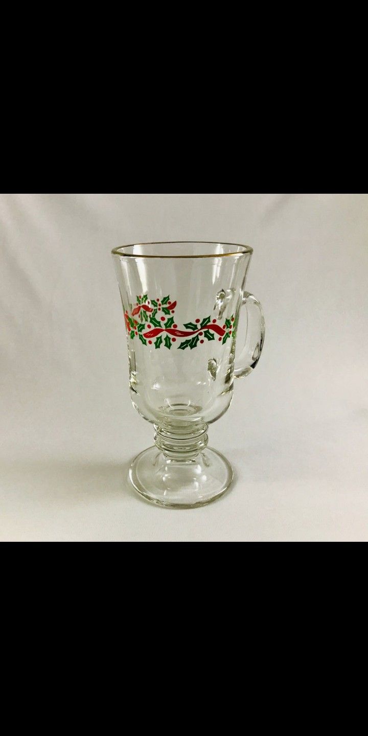 These Christmas Irish coffee mugs are decorated with red and green holly and red bows with a gold trimmed rims. They are pedestal glass. These mugs would be a great addition to your holiday decor. Make it your everyday coffee mug in December or serve hot totties on Christmas morning. They will make a great present for your coffee and tea loving friends! It is in good vintage condition, no chips or scratches. It is 6 inches tall and 3 inches in diameter.