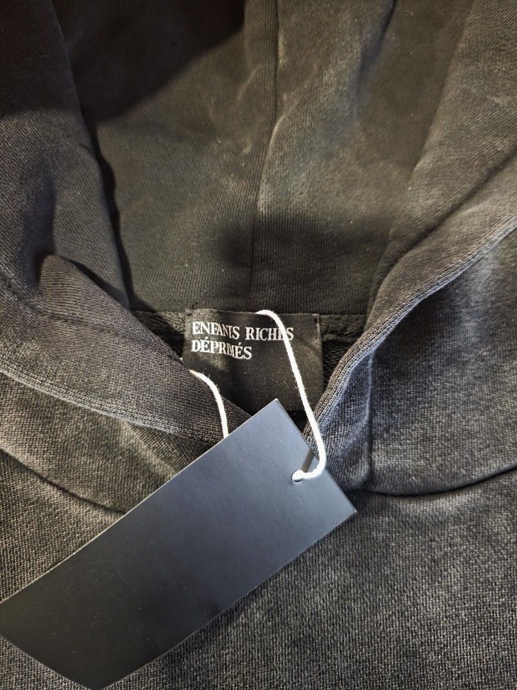 ERD washed black hoodie with front pocket graphic and bold back print. Size XL, great condition. Heavy, high-quality