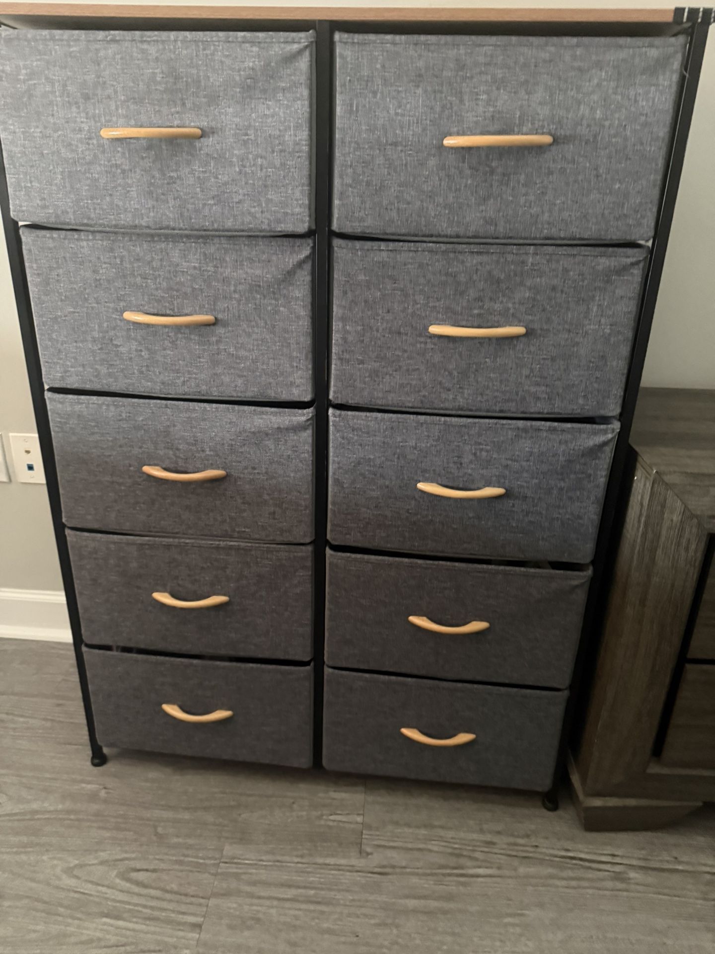 10 drawer fabric chest good condition, 2 nightstands all clean . One can use a little touch up.