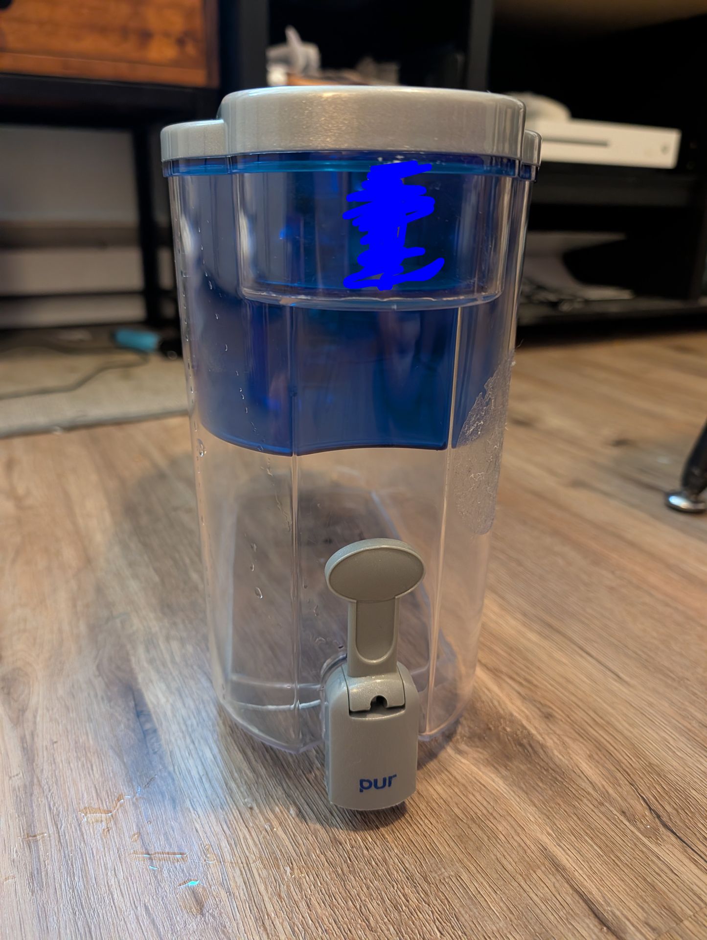 PUR water dispenser in great condition. Clean and works perfectly. I purchased a new water dispenser that fits better in my house, so don't need this one anymore. There is some sticker residue on the outside, but no damage whatsoever! Just cosmetic. Available for pickup now. CASH ONLY