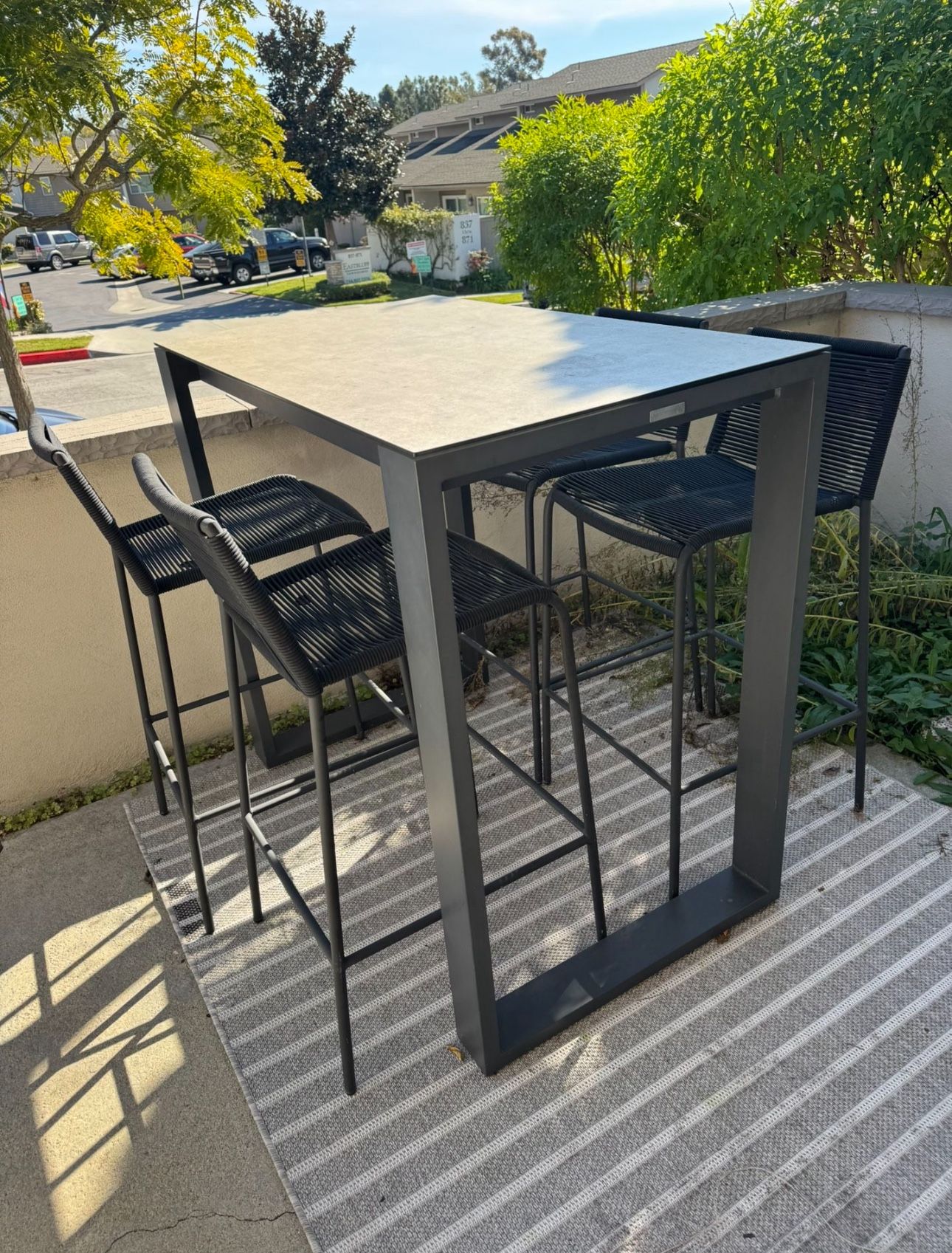 Terra Ventura 48" Bar Table in Charcoal - Ceramic-Style Glass Top outdoor table and Article chairs