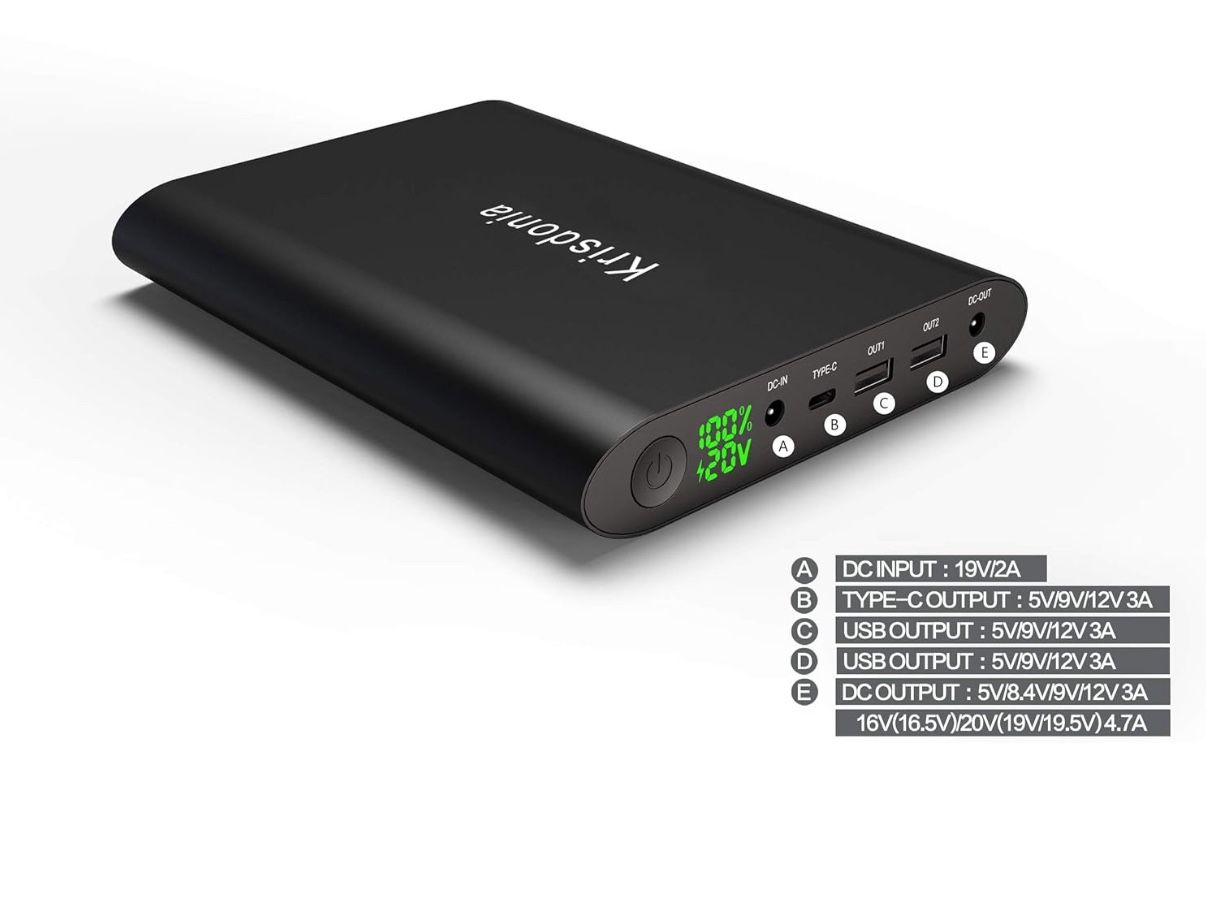 Krisdonia 50000mAh Laptop Power Bank 5/9/12/16/19/20V Portable Laptop Battery Charger with QC3.0 USB-A Port & 12V Type-C Port for Laptop, Tablet, Smar