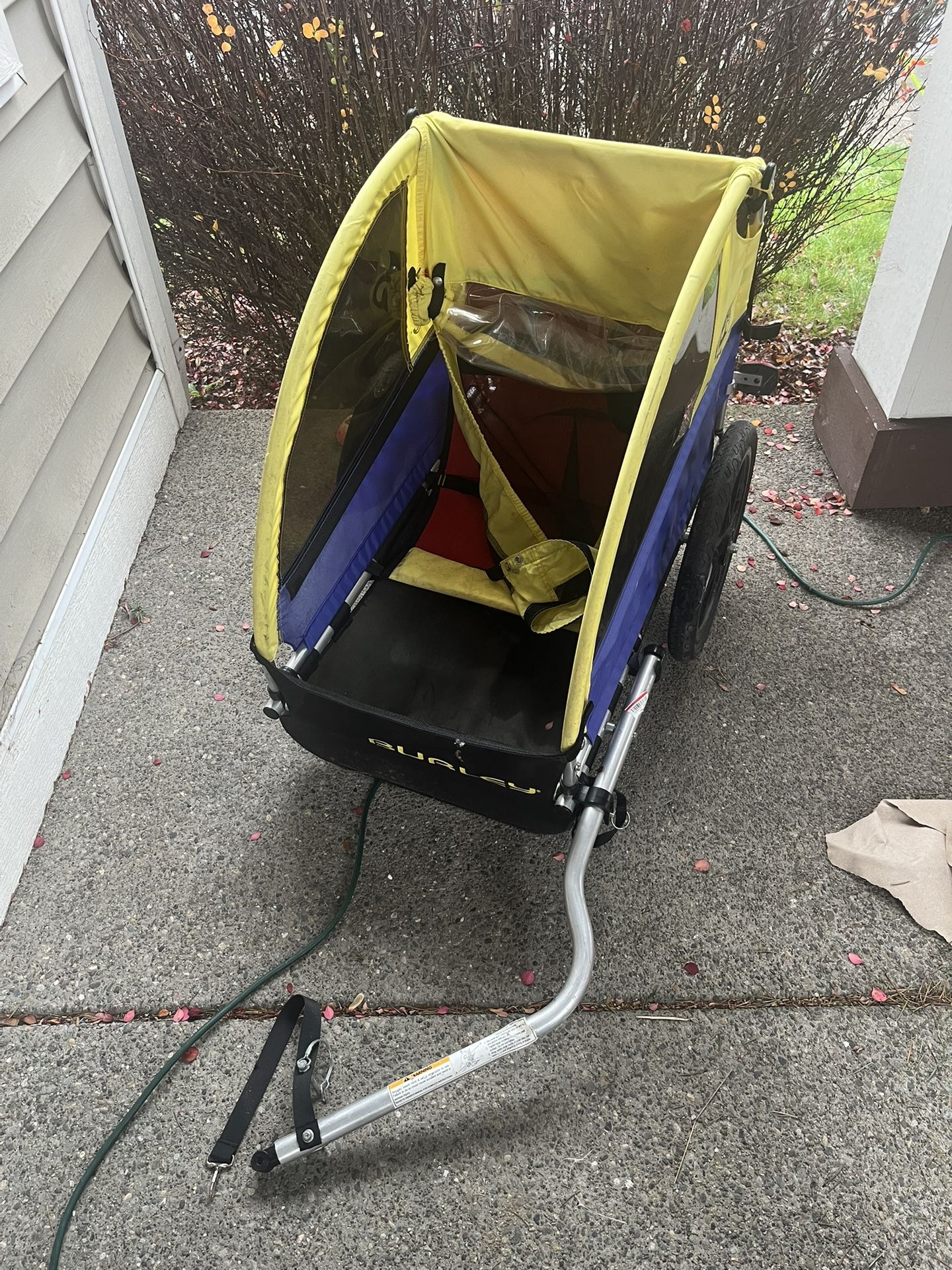 Pre-loved bike hitch for towing a child up ready to go to its next family! Minor wear and tear (see pictures). Description pulled from Amazon (disclaimer that this is a few years old so not all features may apply but I don’t believe the design has changed all that much): - Easy-to-use, bike-only design - Lightweight for easy towing - Adjustable, one-click 5-point harness system to keep kiddos safe and secure - Hammock style seat keeps riders comfy with gentle suspension - E-bike friendly - Contains post-consumer recycled fabrics - Integrated skid guard - Increased headroom - Spacious cargo area for gear, toys, and snacks - Push-button wheels for quick assembly and storage