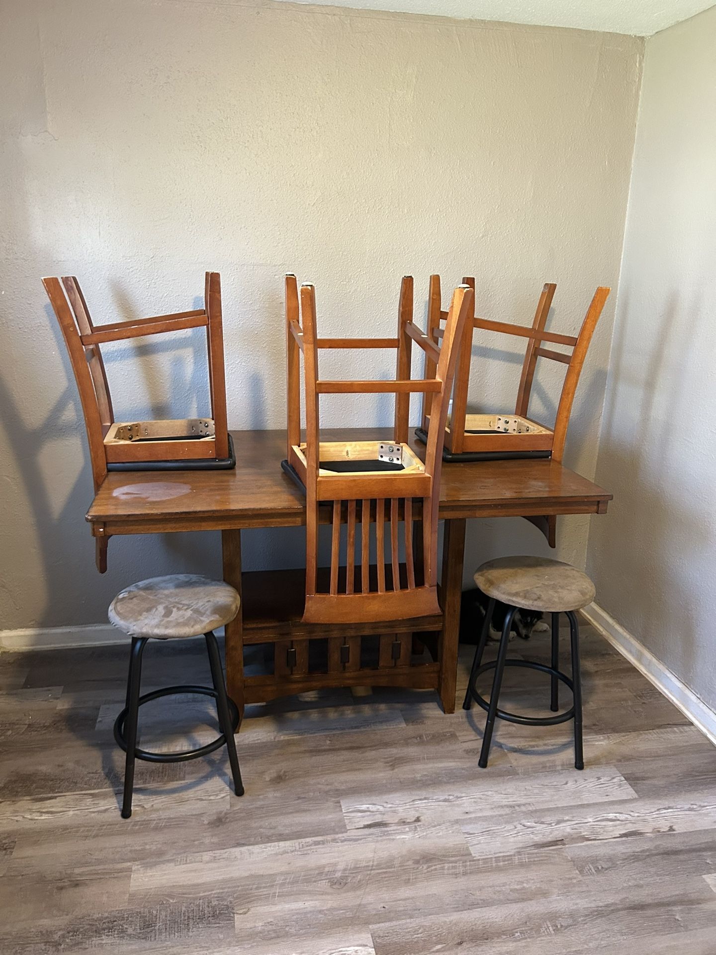Table can use a refurbish But other then that in great shape Asking $100 3 chairs two stools Stools could use a clean