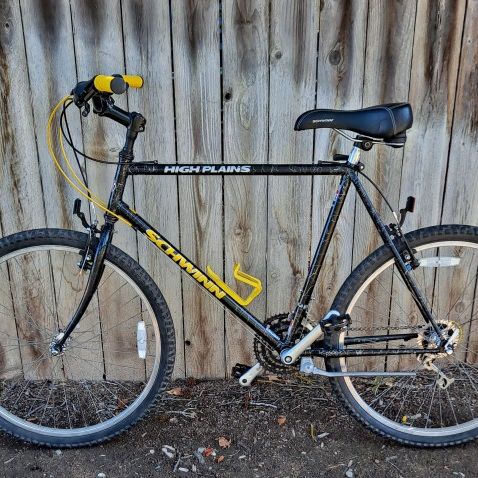 91' Schwinn High Plains 21" Lugged chromoly frame 32" standover Good for riders appx 5'8" to 5' 10" New lock on grips New shift cables New brake cables New cable housing New aluminum stem adapter New sealed bottom bracket New valve caps New bottle cage bolts Newer tires New wheel reflectors Added stem replaced quill stem Added riser bars Added cush schwinn saddle Added vintage specialized bottle cage Added better front deraillure Added a 7 speed cassette Added v brakes Added 3x7 integrated shifter/brake combo Added a newer seat post Added pedals Added front and rear reflectors Cleaned and polished frame Cleaned and regreased headset Cleaned and re greased wheel hubs Trued wheels Polished aluminum bits derusted steel parts Black paint with silver webbing Cool retro ride ready for a new life!