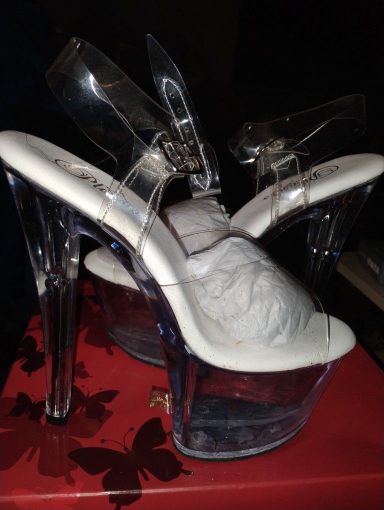 Brand new, never bn worn,still in box Pleasure Heels Style Treasure 808FLA size 8 8inch heels,4inch Platform Pole dancing heels Lightweight,solid clear heels& platform Transparent clear upper& buckle w/white leather insole Online pricing is $89-$125 asking $80 OBO Not firm on price,Willing to consider any reasonable offer,Must sell Won on an online auction site&could never utelize the style so it's a must sell.