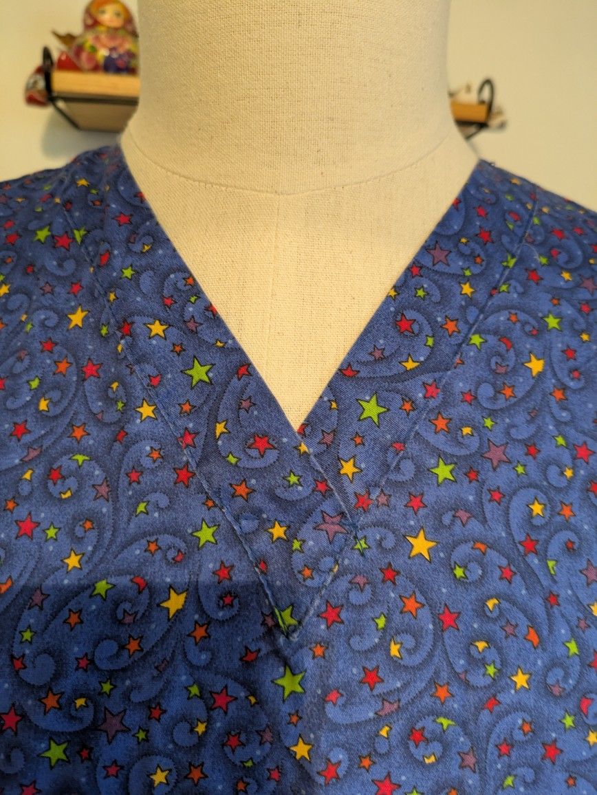 A lightweight blue scrub top with a star pattern. Tag is worn. Not able to see brand or size. Top is approximately a size small. Pit to pit is 21". 2 front pockets, v neck, side slits at hips. Do not message me if this is still available. If it is listed, it is available. I will not respond to you if you do