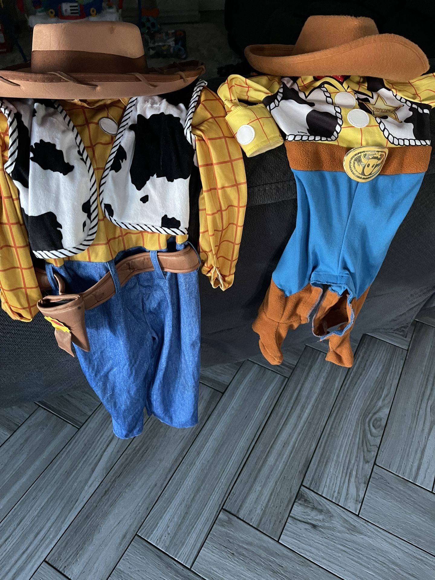 Size 4 Woody costume Size 12-18 month Woody costume Toys story happy birthday background in good condition all . Used only once for my sons bday no longer needed nothing wrong .