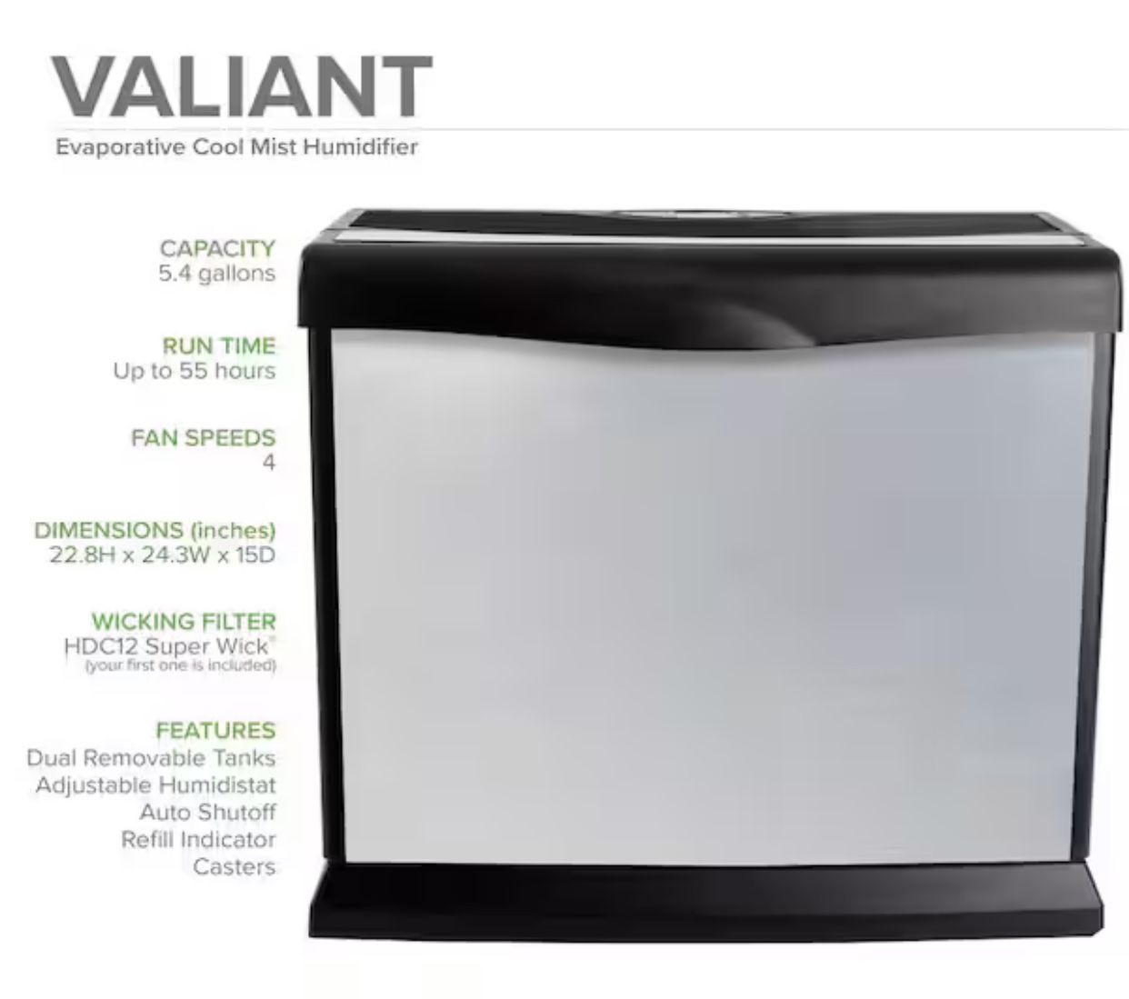 The Valiant is the perfect choice for whole-house humidification. It humidifies up to 4,000 square feet for up to 55 hours on a single fill. Easy to use digital controls make airflow adjustment simple, while the modern wood-tone or nickel finishes make the Valiant fit nicely with any home style.