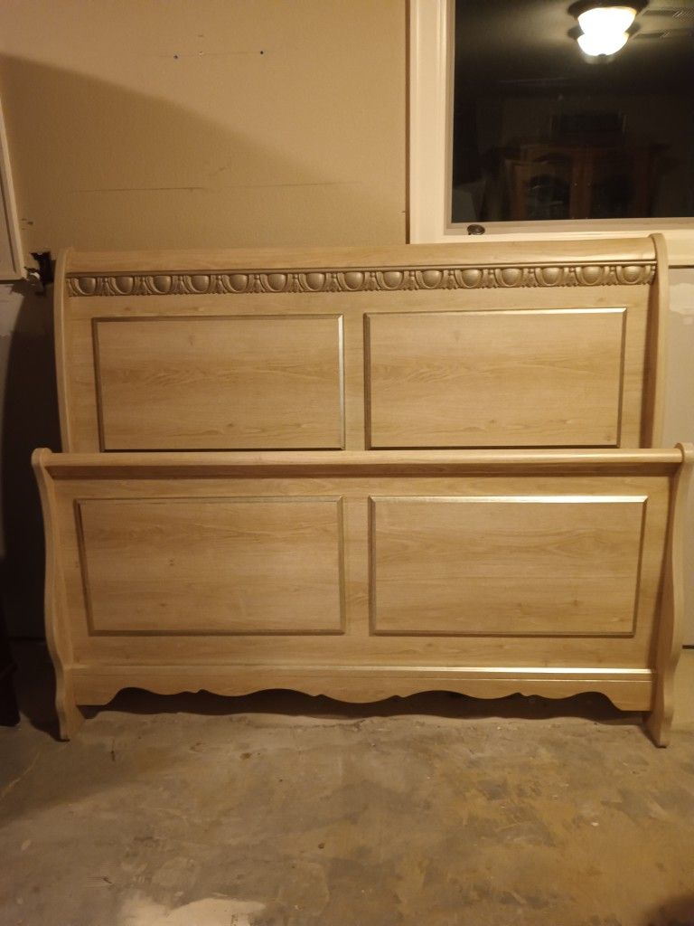 Ashley Furniture: Headboard ,Sleigh Footboard, side boards, rails.. complete bed frame. Silverglade collection. Excellent condition, all parts and pieces included. Frame is a light opulent color over replicated grand chestnut grain. Deeply carved egg and dart mouldings.