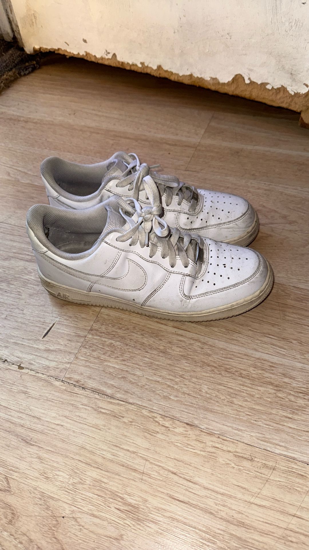 White air forces size 9.5 Nikes. I have used these regularly but have always taken care of them using crease protector guards. They are a little dirty but once you clean them, they’ll look very nice. Exterior is in good shape and interior as well except for the ones shown in the picture. I am selling a ton of things in my page so check it out!