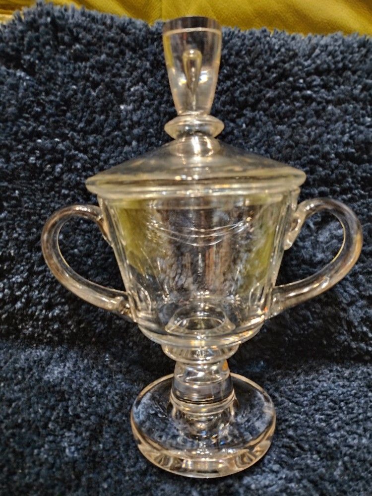 Steuben glass, double handed loving cup, Art glass, wonderful condition, vintage 1958, collectible, luxury item in your kitchen, with the lid is 11 inches high, 8 inches across, 4" at bottom. Super price: $20.00. firm.