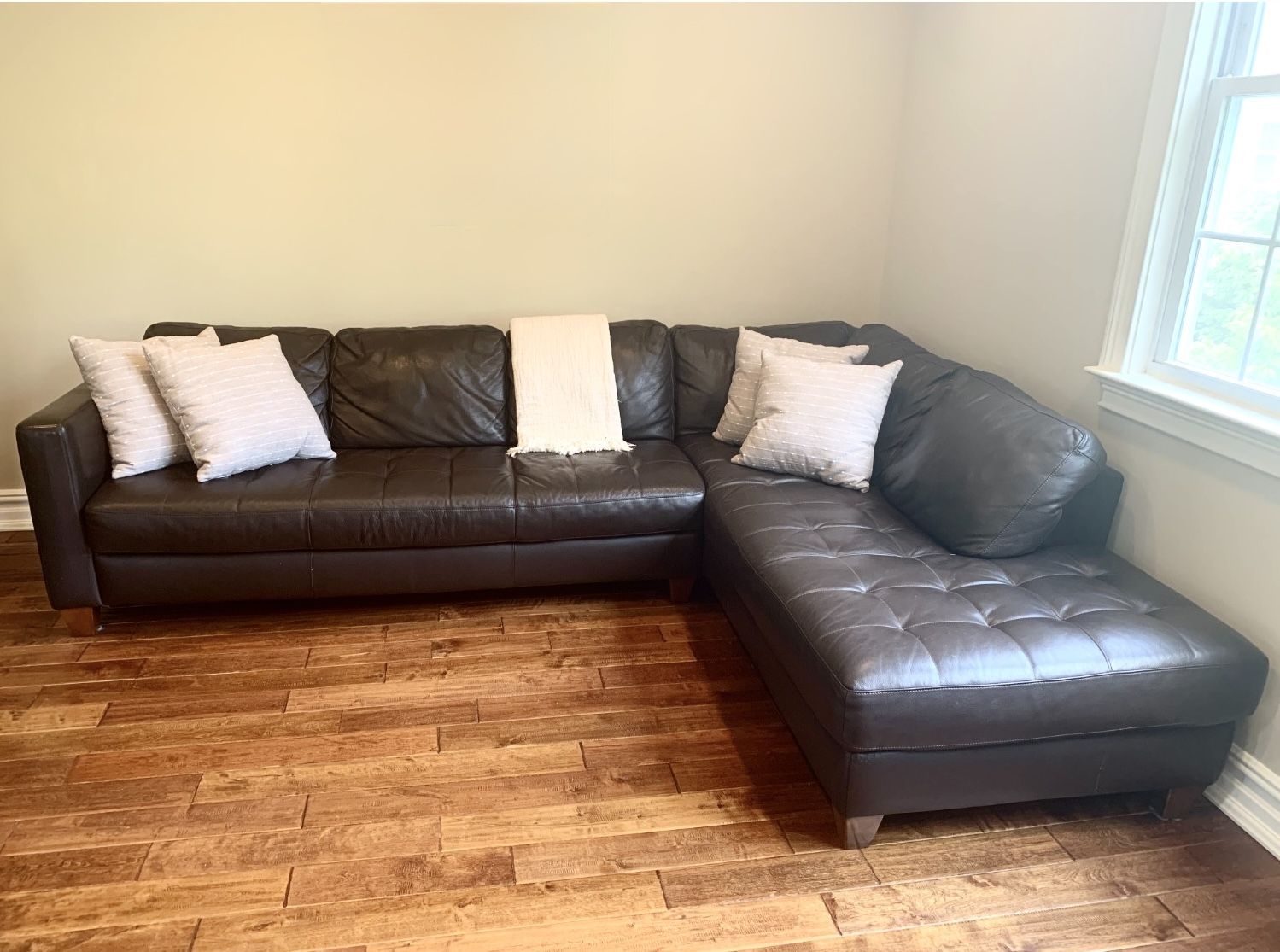 Large, Macy’s 2 piece top grain leather sectional sofa with a left hand side chaise. Leather has nice patina and some fading but still supple. No rips or tears. Cushions soft and fluffy and zip connect to the frame back. Surface wear and some scratches shown in photos. Dimensions: 117"W x 85”D x 35"H purchased for $3500+