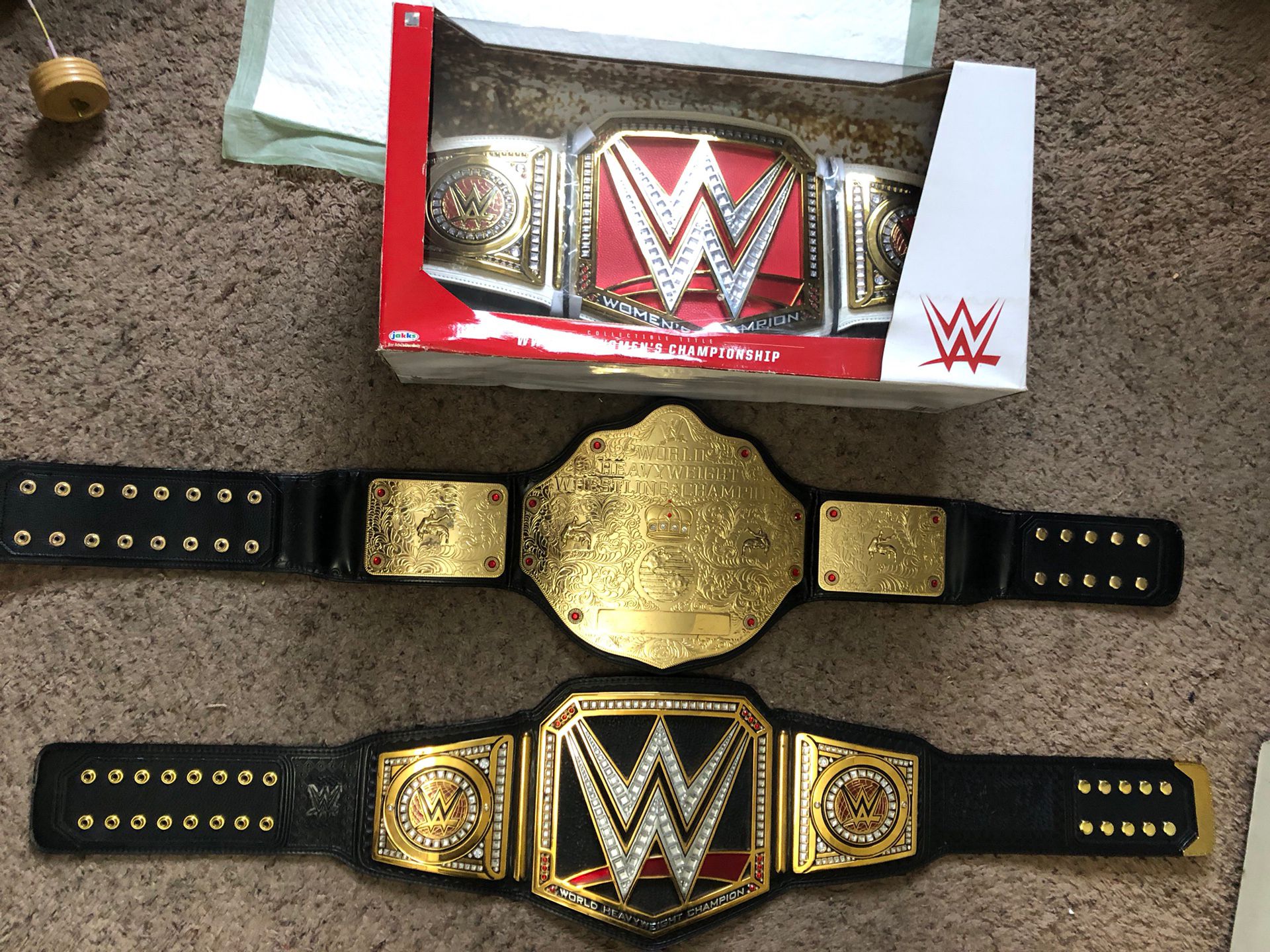 WWE Wrestling Championship Belts New in box and loose WWE World Heavyweight (Big Gold) WWE World Heavyweight (No Longer Being Sold On WWE Shop WWE Raw Women’s Championship, box does have some water damage on the outside Not looking to trade I Am Only Selling As A Set For Now Not Separating, Please Don’t Ask, Cause I Won’t Reapond. Thank you Marvel Legends KO DC Neca S.H Figuarts Lego Transformers TMNT GI Joe Dragon Ball Mezco Mafex Hot Toys Anime Barbie McFarlane 1/12 Scale g. i. joe WWE WWF AEW