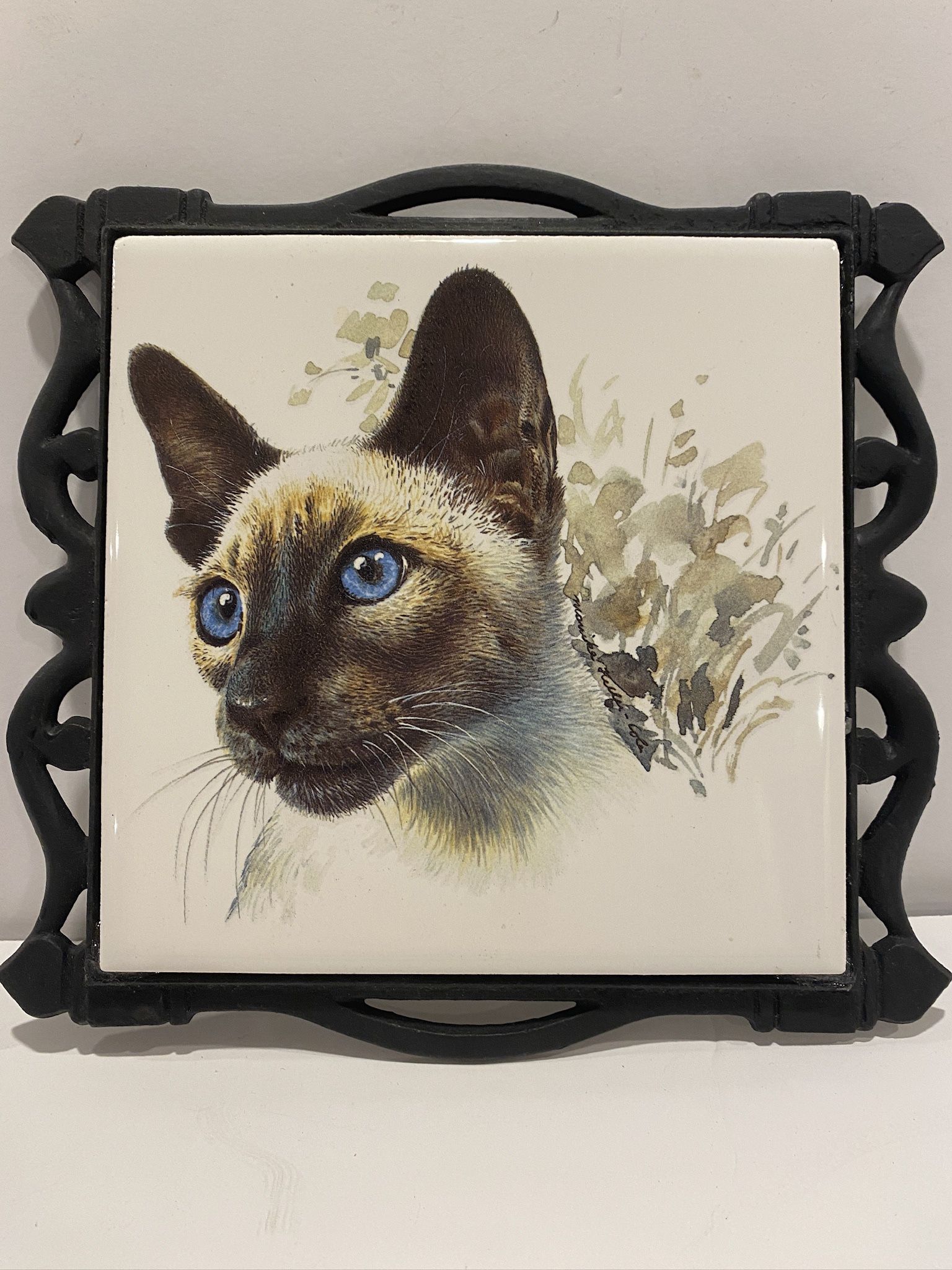 Vintage Siamese Cat Kitty Tile Cast Iron Trivet. Never used. 7.5” x 7.5”