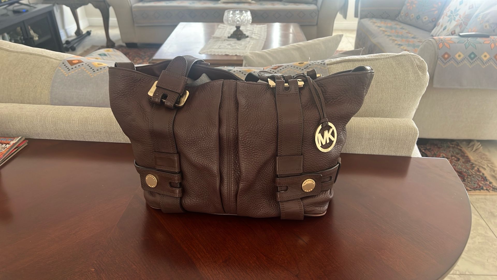 Brand: Michael Kors Style: Harness Grab Bag / Shoulder Bag Material: pebbled leather Color: dark brown/mocha color with gold-tone hardware. Hardware: Features prominent gold-tone hardware, including the signature hanging MK logo charm and round metallic studs/buckles on the front straps. Features: The interior typically includes multiple pockets, such as zip and slip pockets, for organization. It usually has a zip fastening closure.