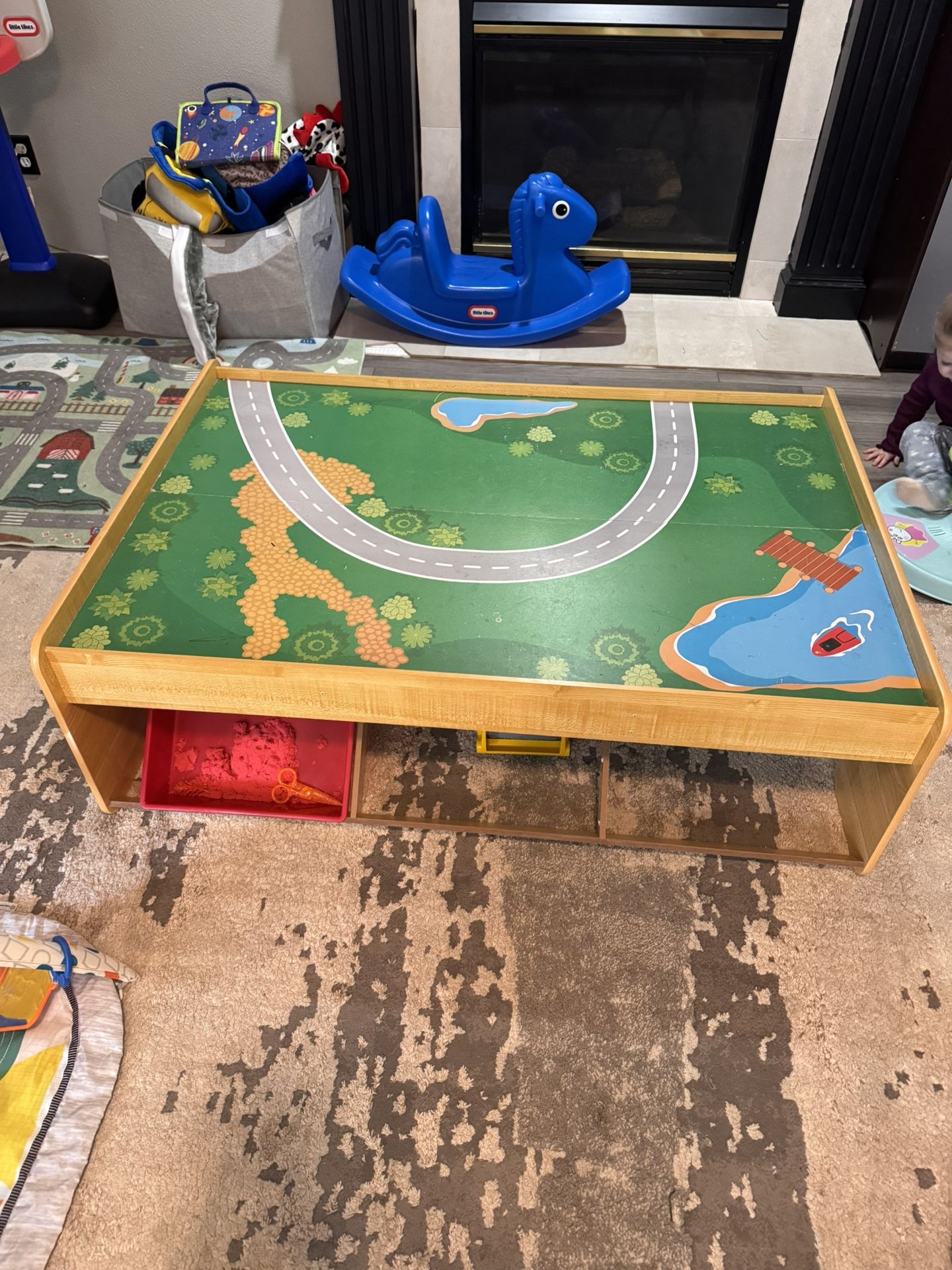 Train table and/or kiddo play table. Comes with 3 red boxes for storage just like the one in photo (my kiddos had the other two) Needs a truck or large space as it does not come apart.