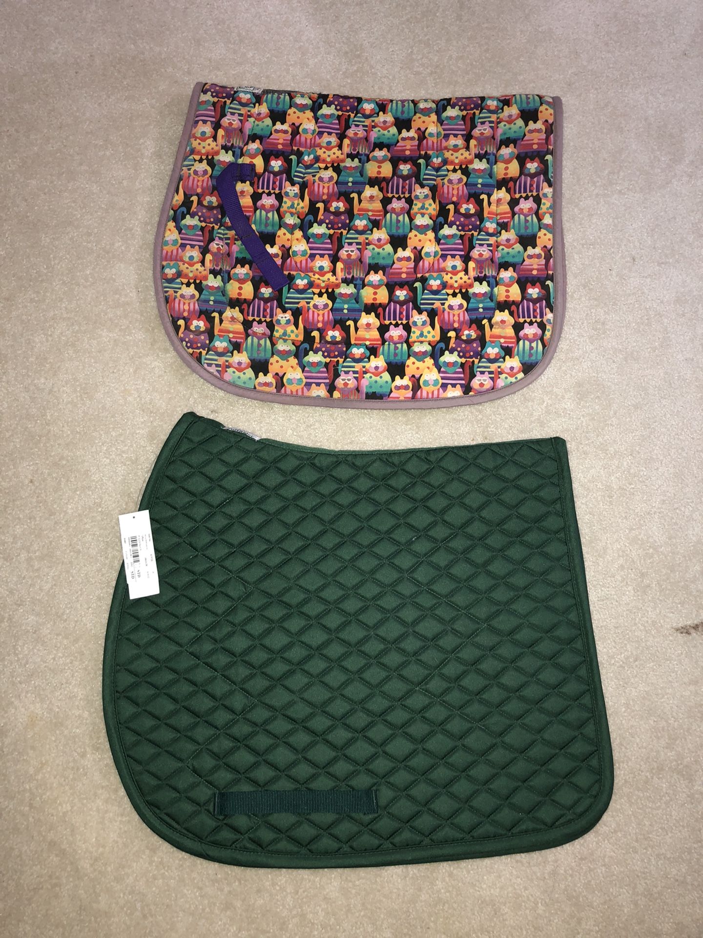 Hunter green pad is New. Pad with Kitties is used. $15 each or both for $25