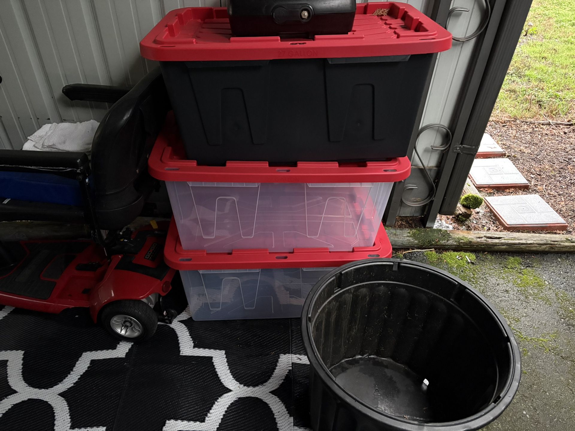 I have 8-9 large storage containers that are clear and black with lids. Only used once for moving. Clean and dry and ready for your storage needs; Christmas, Halloween, thanksgiving items that will stay dry and ready for next seasonal holidays!