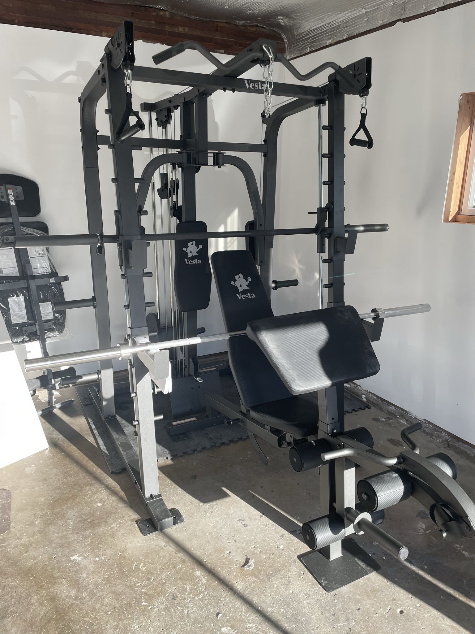 Vesta Fitness Smith Machine 2001 w/Bench Attachment | 230lb Bumpers Weights | 7ft Olympic Bar | Fitness | Gym Equipment | FREE DELIVERY🚚