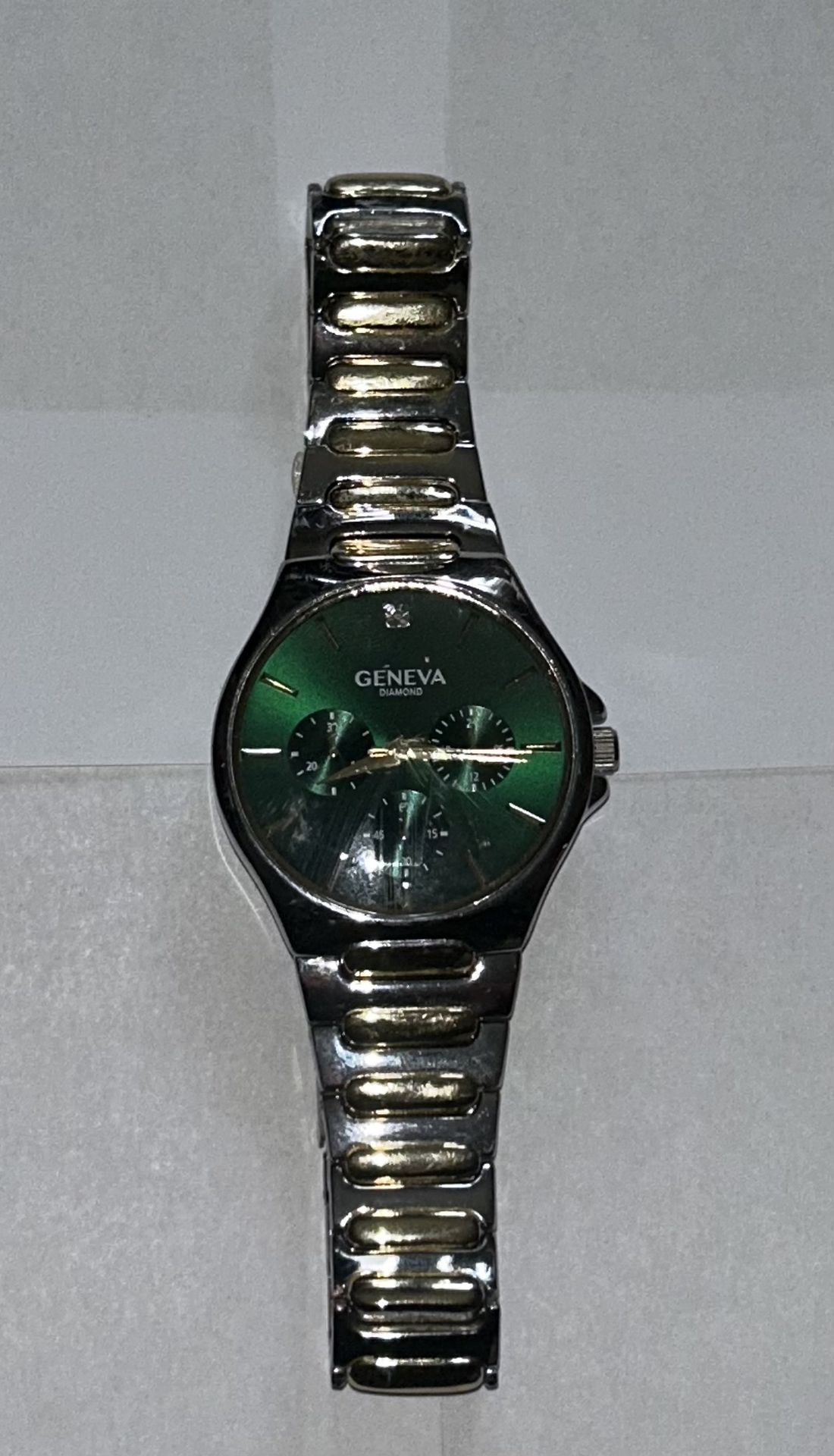 Geneva watch in good condition. Some scratches on it but face still looks reliably clear. Keeps time and looks great. Nice simple everyday watch.