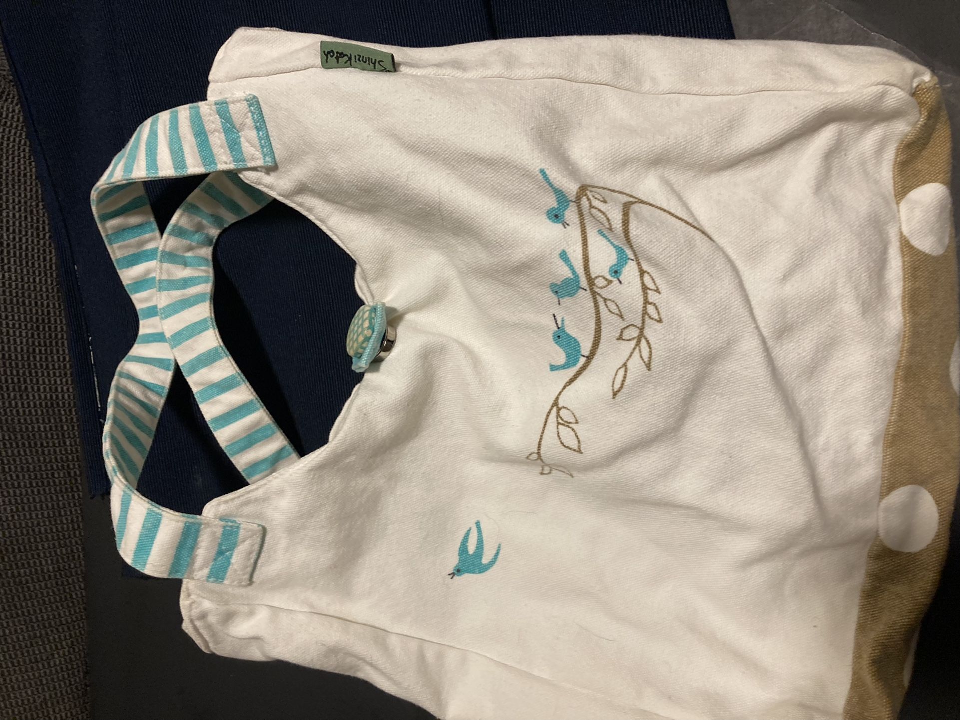Beautiful and cute tote bag for that nice trip to the fashion mall. 13" deep, 12" wide, chrome snap buckle, outside zipper pocket, peppered with Shinzi trademark blue swallows. Small faint stain on bottom (see photo )