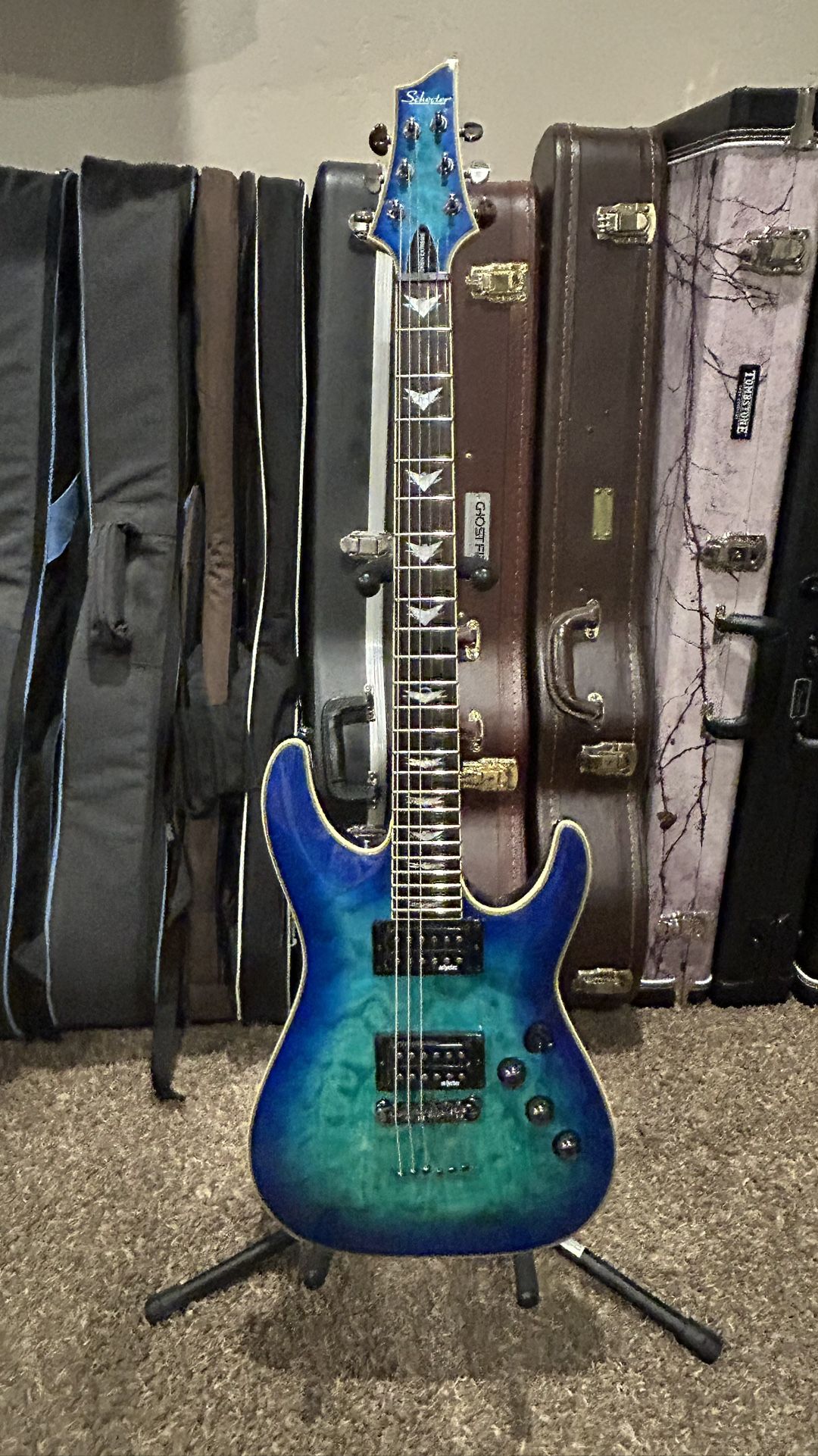 Finish - Ocean Blue Burst. Rosewood fretboard with 24 extra-jumbo frets. Powered by dual Schecter Diamond Plus humbuckers with coil-splitting for tonal versatility. I’ve setup the guitar Neck Relief - .006 at the 6th fret. Action - 5/64th. Humbuckers - 3/32nd