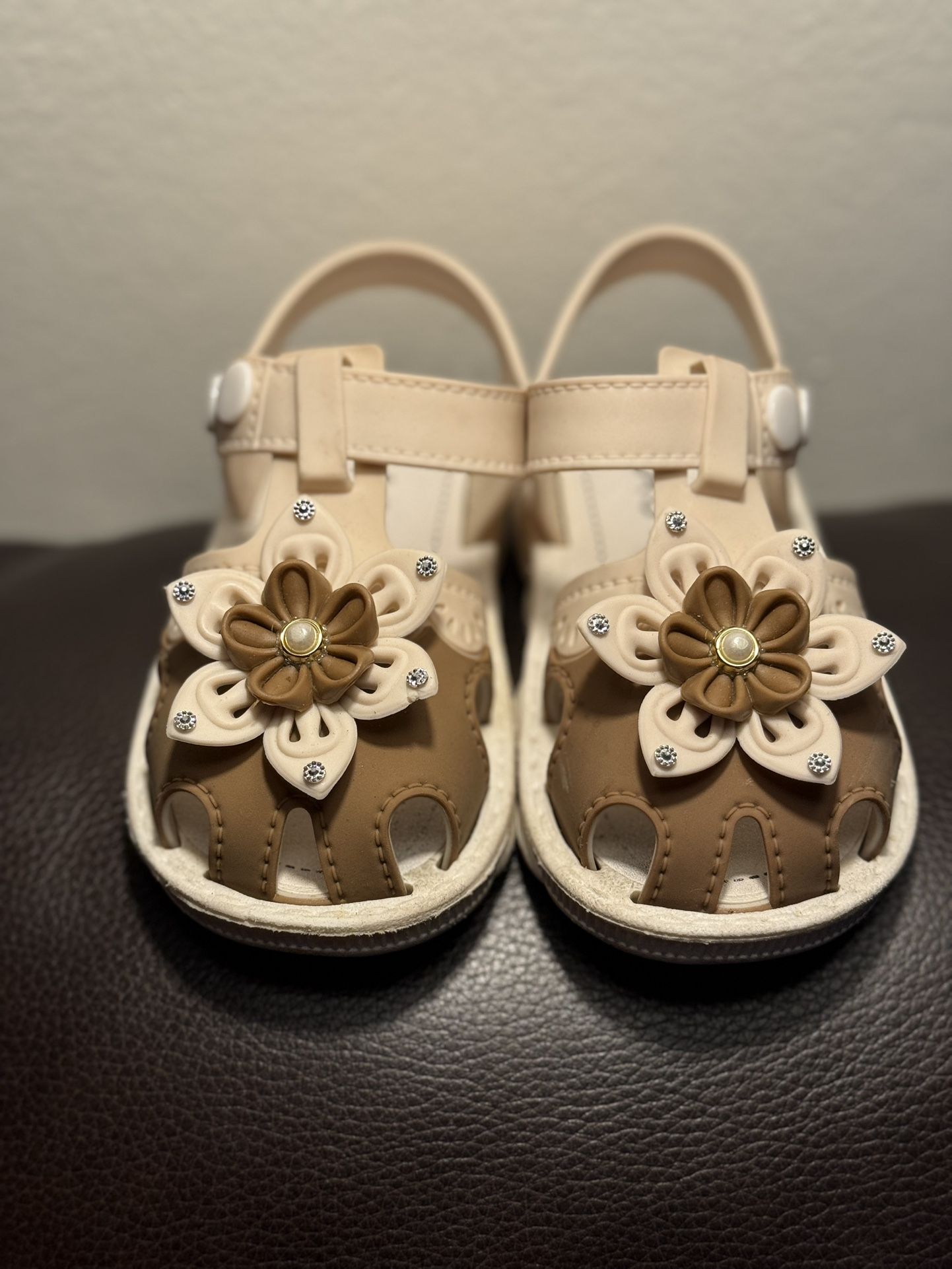Adorable toddler girls’ jelly sandals with a 3D floral design and pearl accent. • Size: 25 (fits approx. US Toddler 8–8.5) • Color: Beige and brown • Condition: Pre-owned, gently used with light wear on soles (see pics). • Features: Adjustable strap, soft flexible sole with teddy bear design, slip-resistant bottoms. Perfect for summer, casual outings, or dressy occasions!