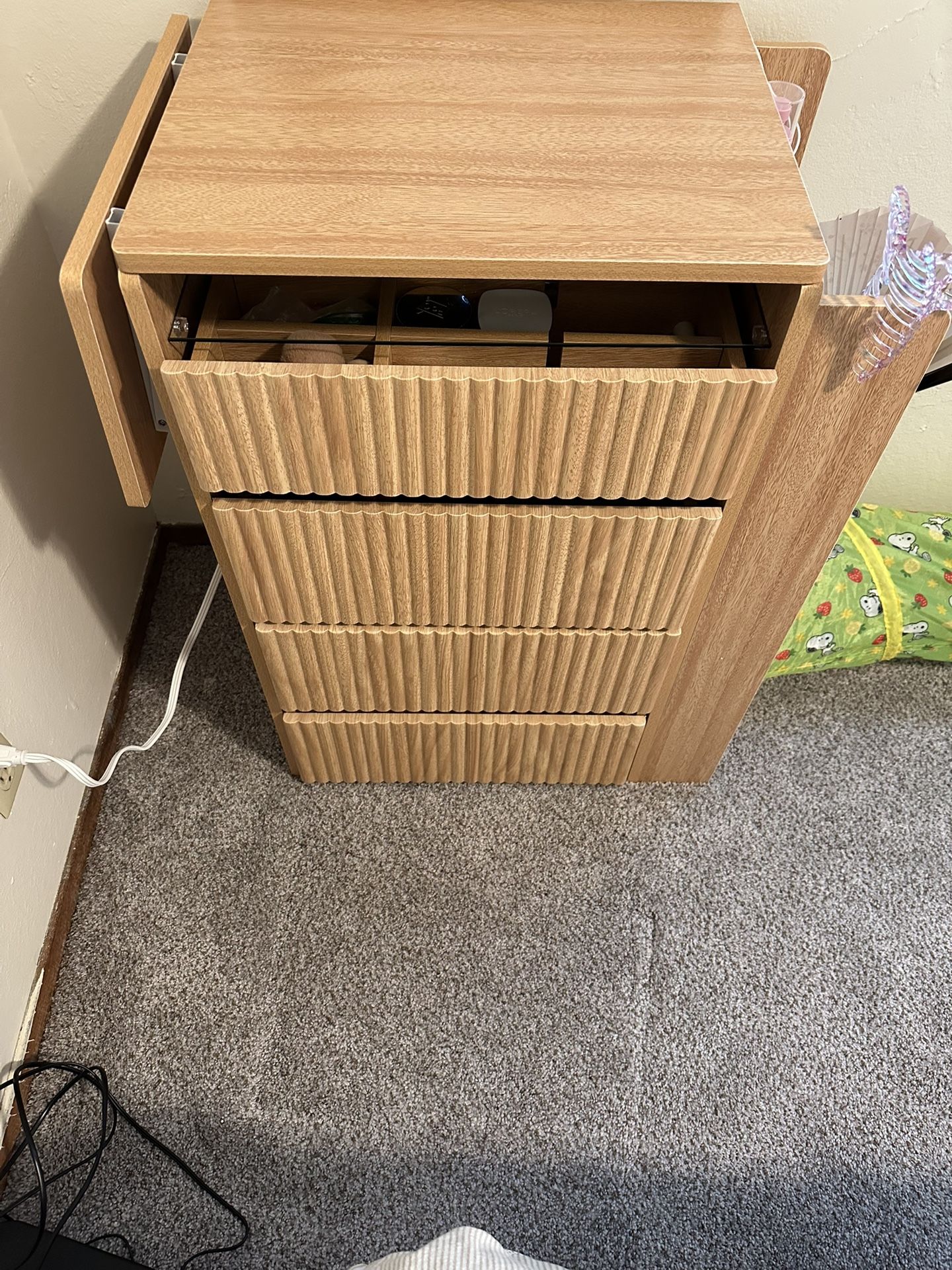 Brand new modern fluted wood chest of drawers with 4 drawers and a drop-leaf tabletop.