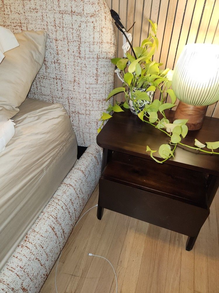 A streamlined nightstand with a warm wood finish and crisp, architectural lines. Designed to feel light yet substantial, this piece balances practical storage with a minimal footprint—ideal for modern, mid-century, or Scandinavian-inspired interiors. The single drawer keeps bedside essentials tucked away, while the open lower shelf offers easy access to books or styling objects. Elevated on slender legs, it brings a calm, intentional presence to the room without visual heaviness. Item is brand new, unused, and still in box. Details: • Original retail: $180 • New in box, never used • Smooth dark wood finish • One drawer + open shelf • Clean-lined, modern silhouette Perfect for a primary bedroom, guest room, or apartment where thoughtful design matters. Pickup only. Cash or electronic payment accepted.