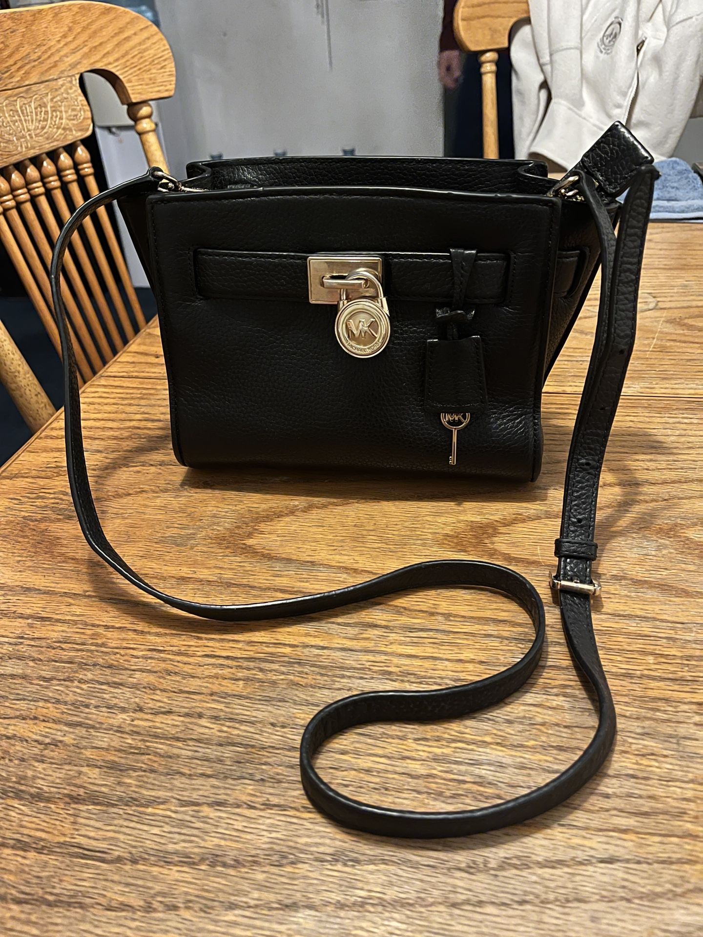 High desert south Adelanto pick up- Micheal Kors Black Pebble Quality Leather Crossbody Long Strap Clip-on Purse in excellent condition really clean inside & out. Has gold key lock design that has 1 flaw on gold metallic area w/ scuffs scratches from swinging rubbing. Dark black shimmer print name logo material inside with zipper & slip pockets for both each sides, $65 only.