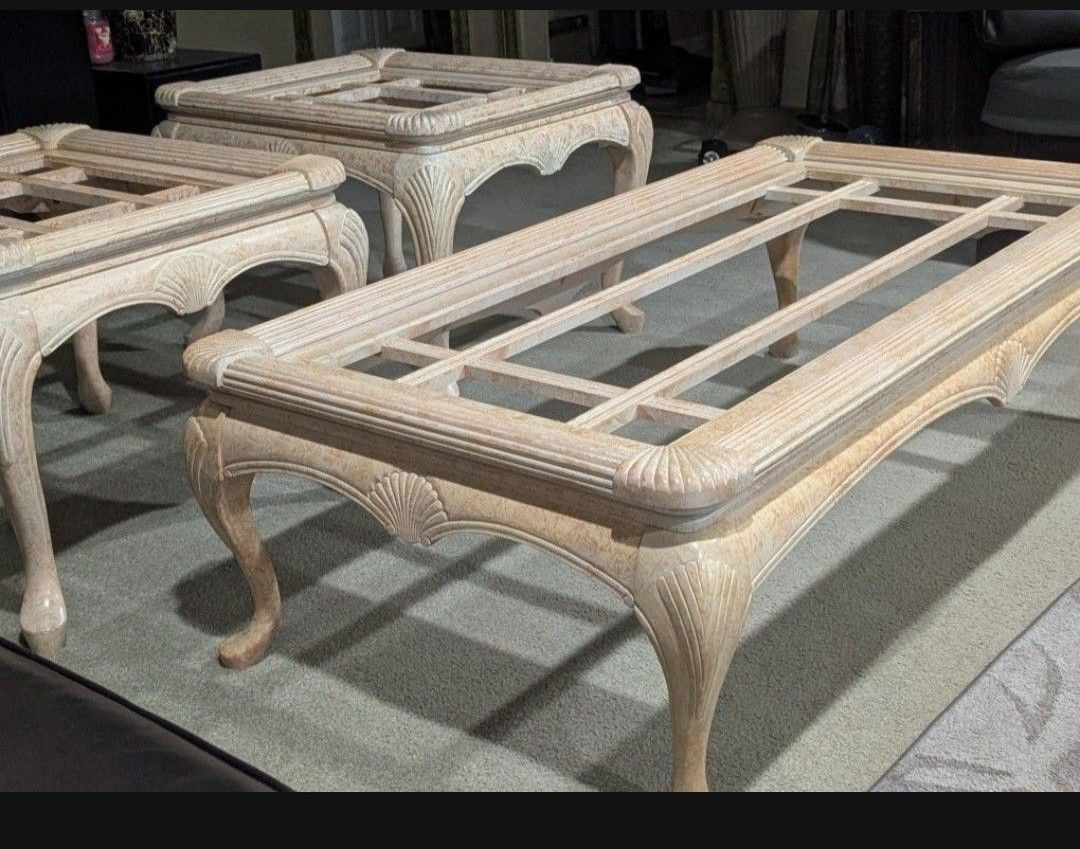 Three living room tables, one coffee and two end tables with glass tops, well taken care of in very good condition, COFFEE TABLE DIMENSIONS 53 and 1/2 long X 27 and 3/4 wide X 16 " tall