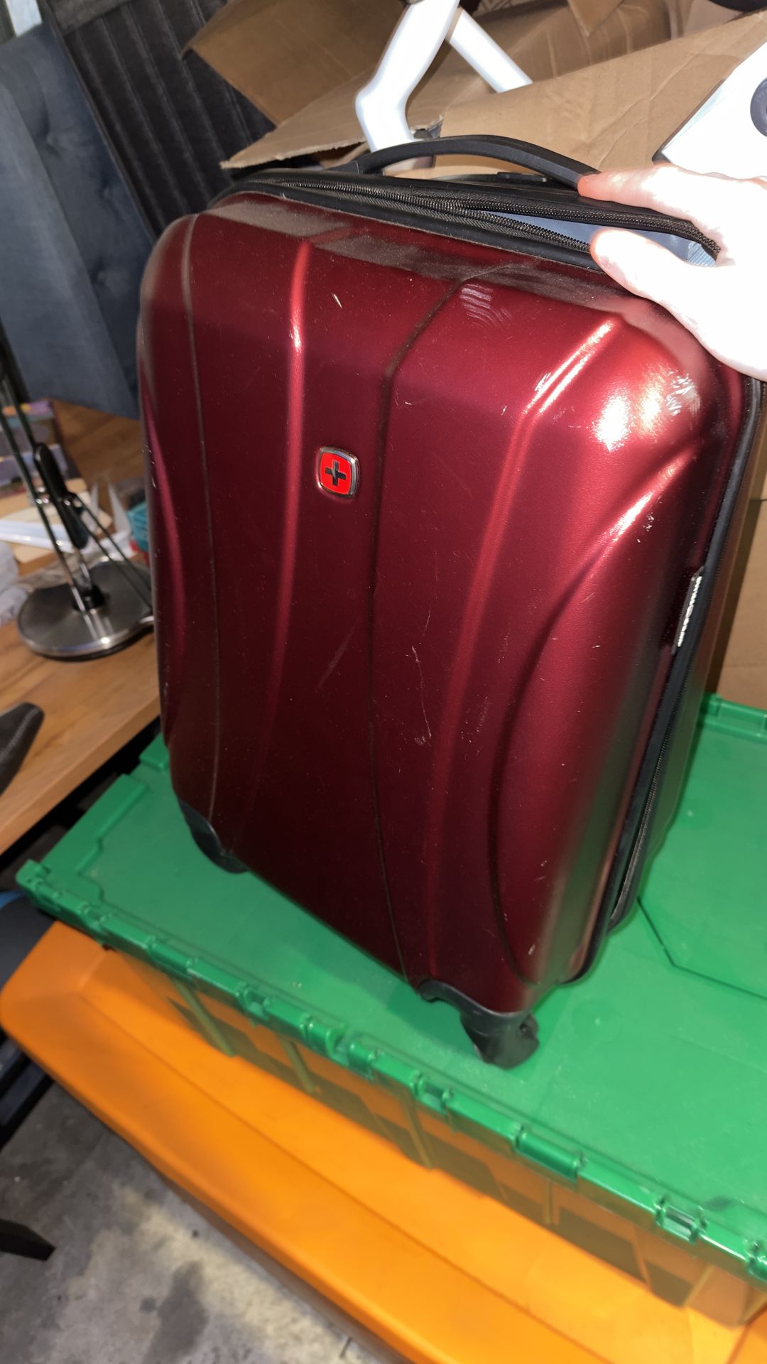 Swiss Gear hardshell carry-on suitcase, burgundy. Scratches on the outside from normal use, interior is clean. Wheels and zippers work. Federal Way pickup.