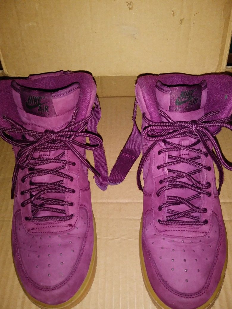 Ad is current deleted when sold asking $50.00 Clean inside and out! Nike air force 1 purple bordeaux sneakers, size 7y 25cm. Nike size chart states also womens size 8.5 and a mens size 7. Roughly measures 10.5in long, 6in from bottom to top. Hightop or Mid? Hardly used at all still has that New sneaker suede/leather smell. Any spots seen in pictures are from touching the suede. Soles are clean too