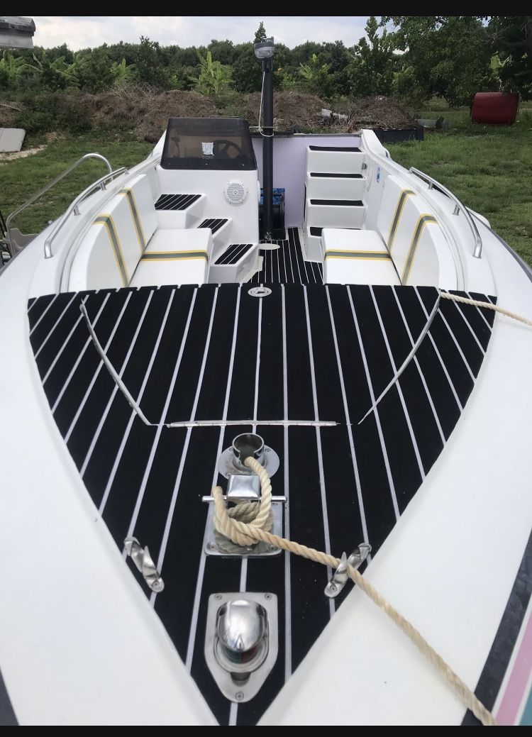 8 feet long by 3 feet wide self adhesive easy to install non-slip easy to clean non-absorbent feels very nice to walk on will increase the value of your boat looks beautiful $100 each sheet 8 pies de largo por 3 pies de ancho trae su propio pegamento fácil para instalar no se le penetra el agua o la sangre no resbala fácil para limpiar Esto es una inversión para su bote le sube el valor $100 cada lámina de 8x3