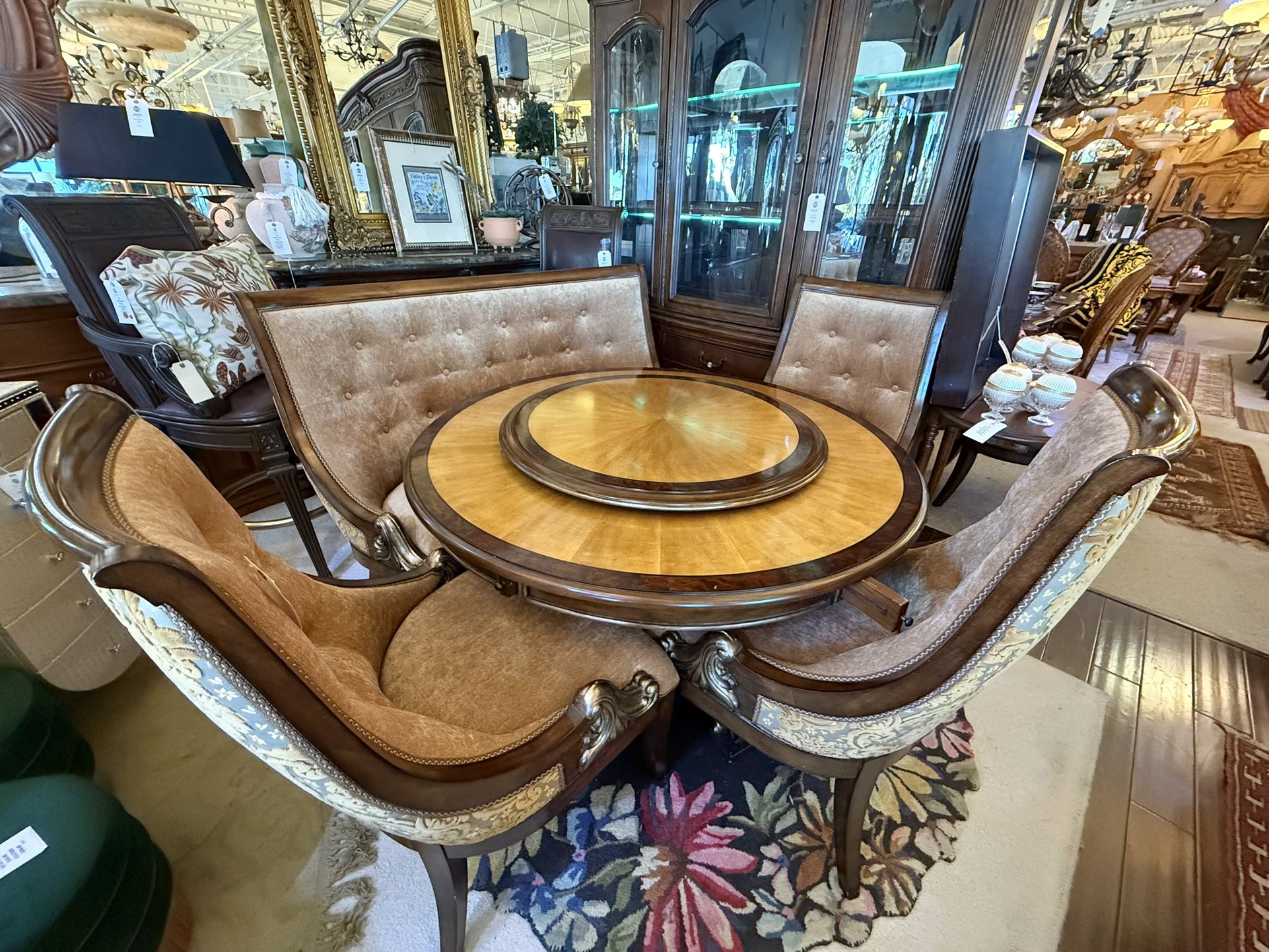 WE HAVE A LARGE INVENTORY IN HIGHEND FURNITURE, WOOD FURNITURE WITH ALL DIFFERENT COLLECTIONS. DINING ROOM SETS, BEDROOM SETS, LIVING ROOM SETS AND MANY OTHER BRANDS LIKE MAITLAND SMITH, VERSACE, BERNHARDT, HENREDON, BENNETTI AND ALSO ITEMS TO COMPLEMENT YOUR HOME DECOR, ACCESSORIES, PERFUM, JEWELRY, CHANDELIERS AND MORE. Available to see in person in Fort Lauderdale!!!! WAS BEFORE: $3295 NOW: $2636 Classic style dining set. The table is made of solid wood with a mahogany finish, with a marquetry pattern on the surface and a Lazy Susan (swivel tray) in the center. It has a robust central pedestal base and carved legs with an ornate design, characteristic of the Louis XV style. The polished wood finish has an intense shine. The chairs that accompany it are upholstered armchairs, also made of wood with decorative carvings and a finish includes golden touches. They have high and curved backrests, and the upholstery is a brown/bronze fabric with a subtle decorative pattern on the backrest. They have padded seats for greater comfort, ideal for long dinners. In excellent condition! We also have AICO By Michael Amini Collections… AICO Furniture designed by Michael Amini has been a TOP name brand since 1988 AICO, which stands for Amini Innovation Corp, features original furniture designs and is known for high quality and intricately designed home furnishing case goods and upholstery. They offer many collections that suit various tastes and styles. Ask for our FINANCE LAYAWAY program!!! 🦊 Additional we have Available FINANCING with Klarna, PayPal, ACIMA And more!!! Available at: Snooty Fox Consignments 840 E Oakland Park Blvd Oakland Park, FL 33334 754.206.20.77