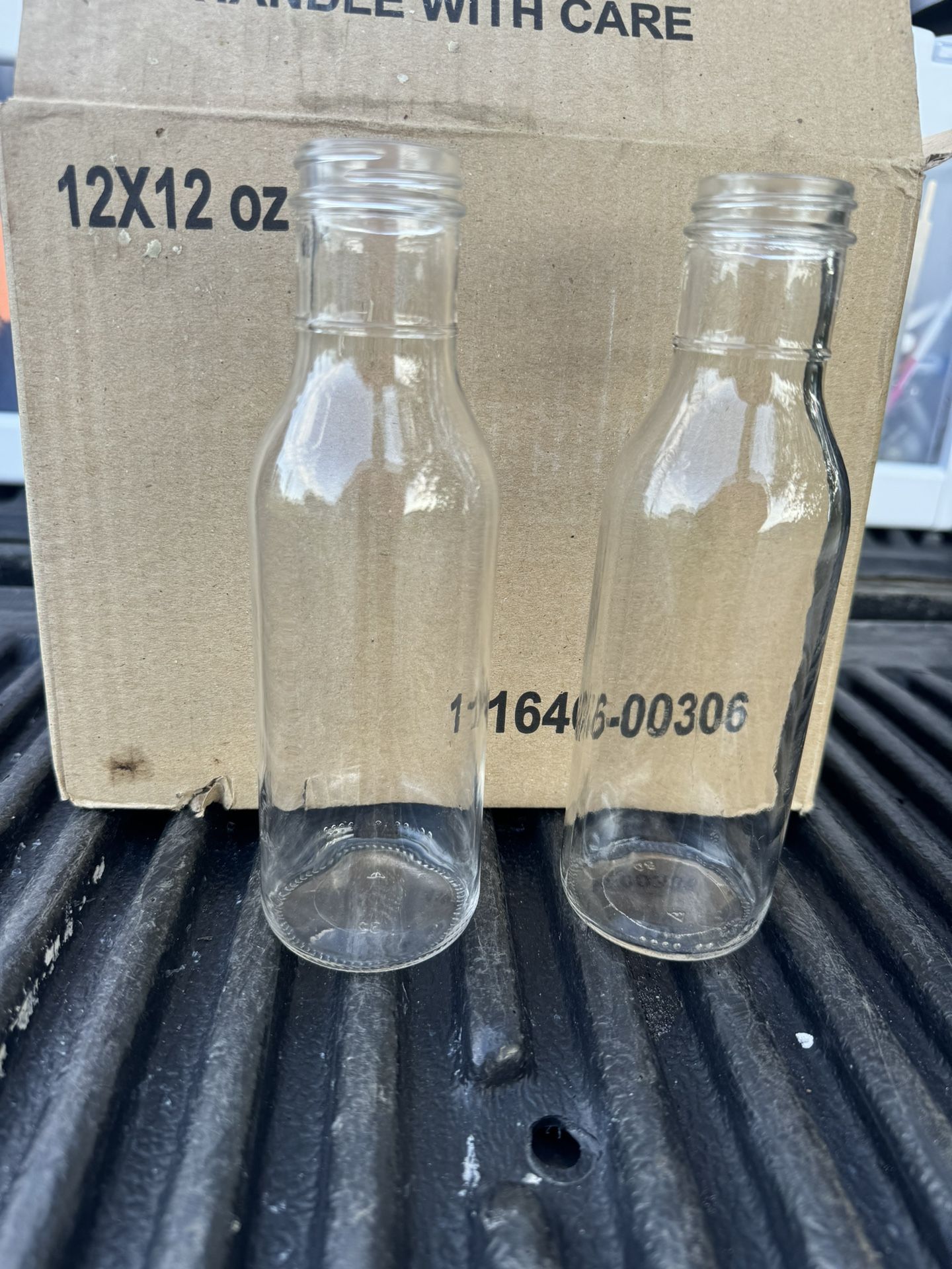12 oz …12 in a box….clear glass bottles …use for drinks, sauce, etc …..