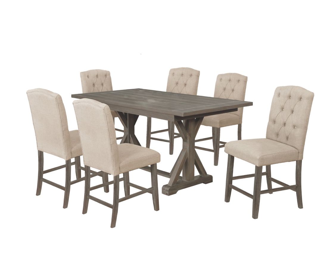 Rustic Counter Height Dining Table Set - Table With 6 Beige Tufted Chairs
