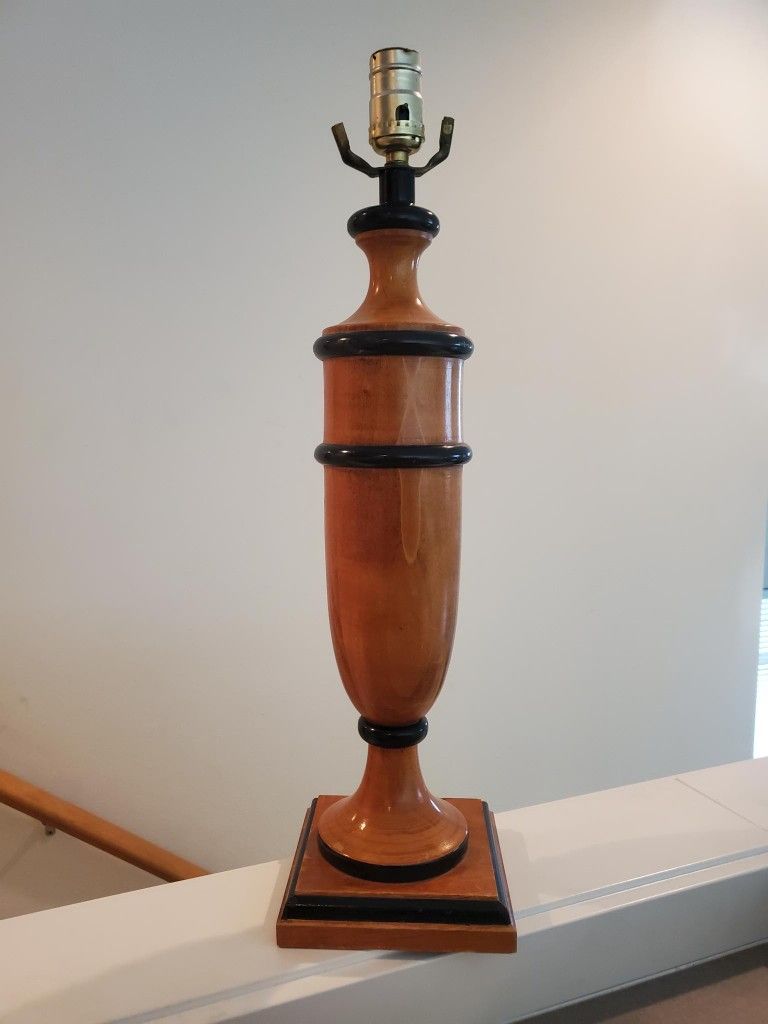 1998 wooden lampstand with black accents This sleek wooden lampstand is a perfect neutral piece to complete any house decor. Great for midcentury modern homes. Has a few chips but still has great character. Lampshade and lightbulb not included.