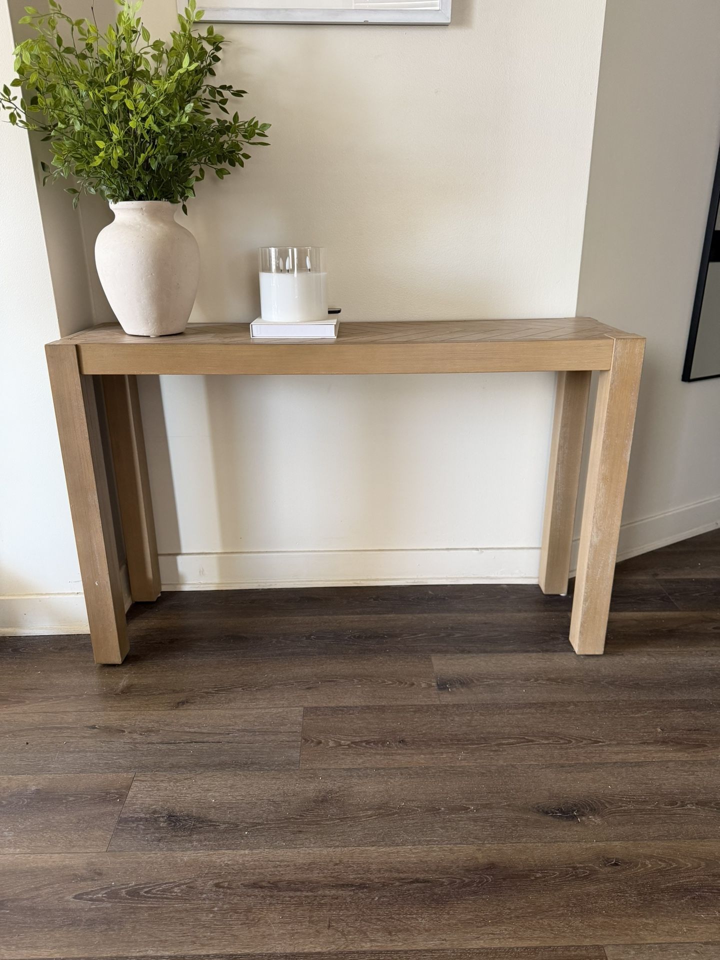 Bayshore Herringbone Console Table Brown from Threshold. Gently used but has a small water mark from a flower vase (see photo) Height: 30 inches Length: 48 inches Width: 14 inches Color: light wood